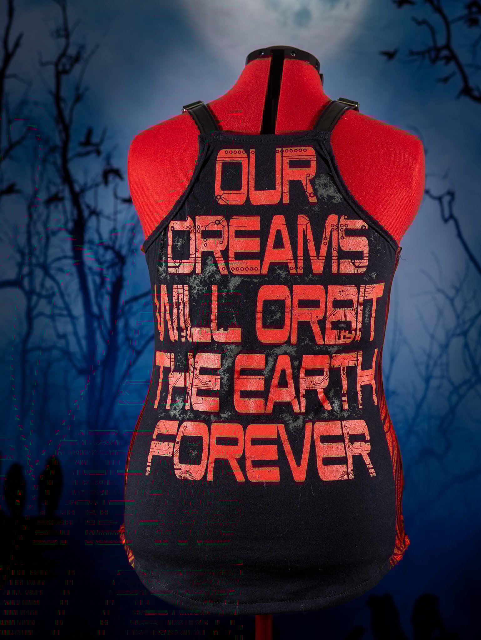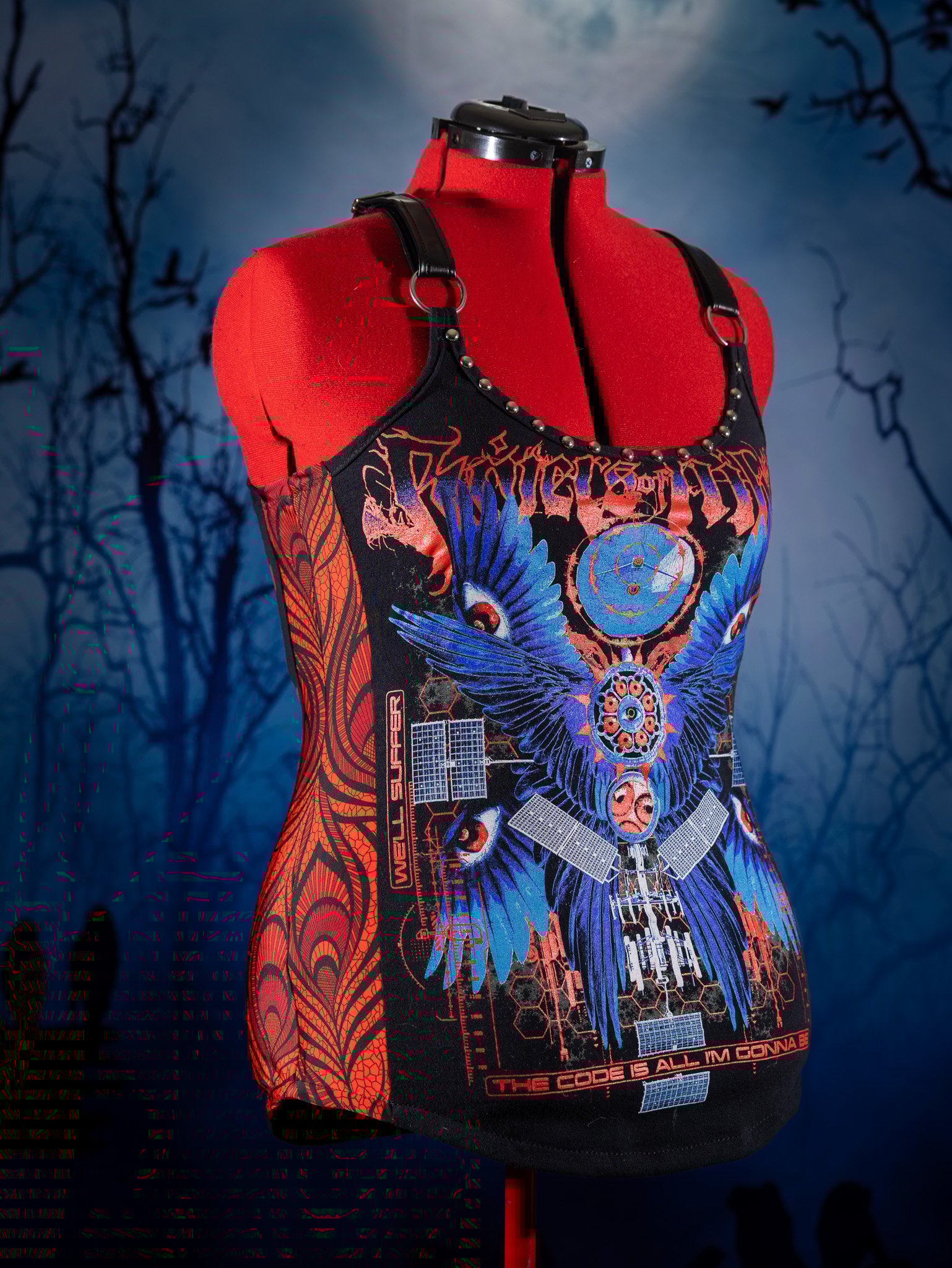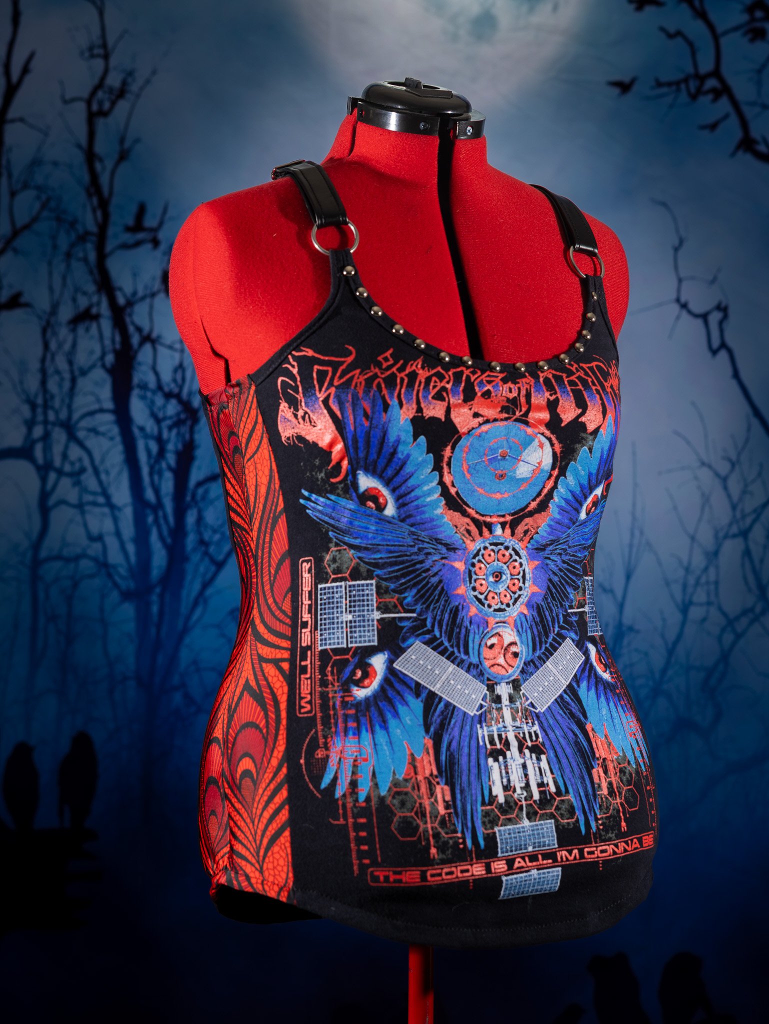 This listing is for one Rivers of Nihil Tank Top. I made this using a previously owned, officially licensed Rivers of Nihil tee. I cut it into a cute little tank top with panels of red peacock feather print spandex. The neckline is accented with metal rivets and faux leather straps are connected with metal o-rings and have metal adjustable sliders.