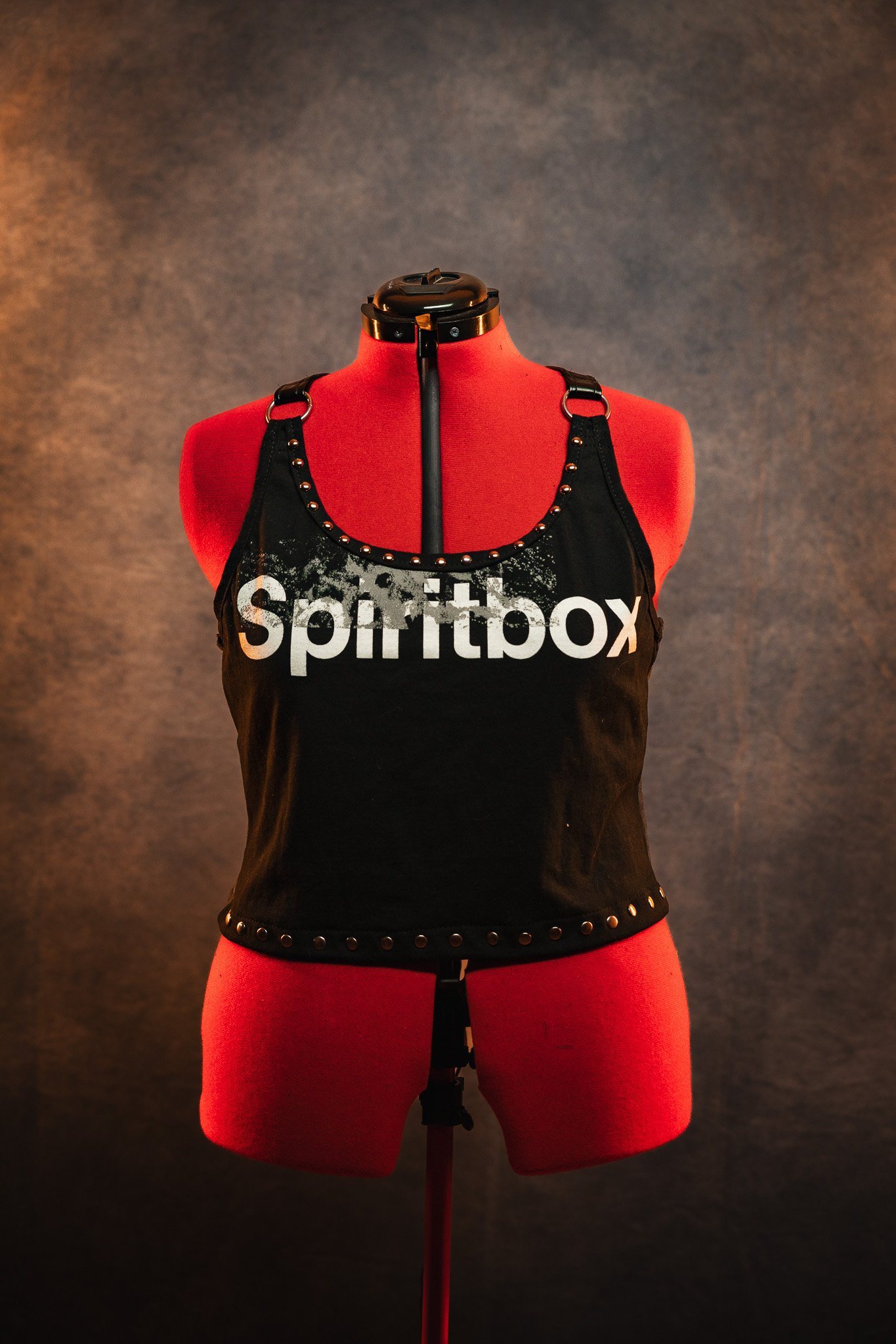 Made using a previously owned, officially licensed Spiritbox tee. I cut and sewed it into a cute crop top accented with metal studs with adjustable faux leather straps. The back is made from soft cotton knit fabric layered with grey stretch lace. Laces up with eyelets in back for an adjustabkle fit.
