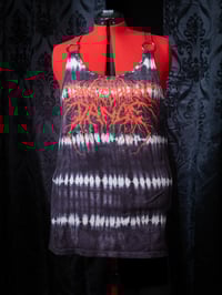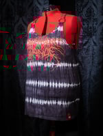 I made this using a previously owned, officially licensed Dance Gavin Dance Shibori Threads tee. I cut it into a scoop neck tank top. I added shiny red straps connected with metal o-rings. I added metal rivets along the bust as well. The original dye job on this top is so cool and the material is very soft.