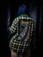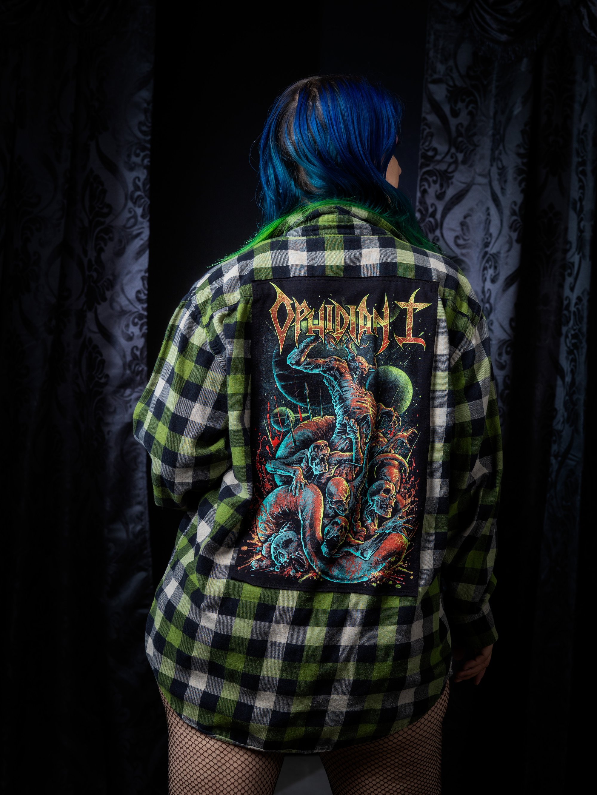I made this using a thrifted flannel and a previously owned, officially licensed Ophidian I tee. Flannel is in good condition but is used so may have some light signs of wear. I cut out the Ophidian I graphic on the used tee and sewed it on the back of this flannel. Flannel brand is Craft & Barrow. See measurements below.