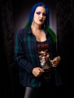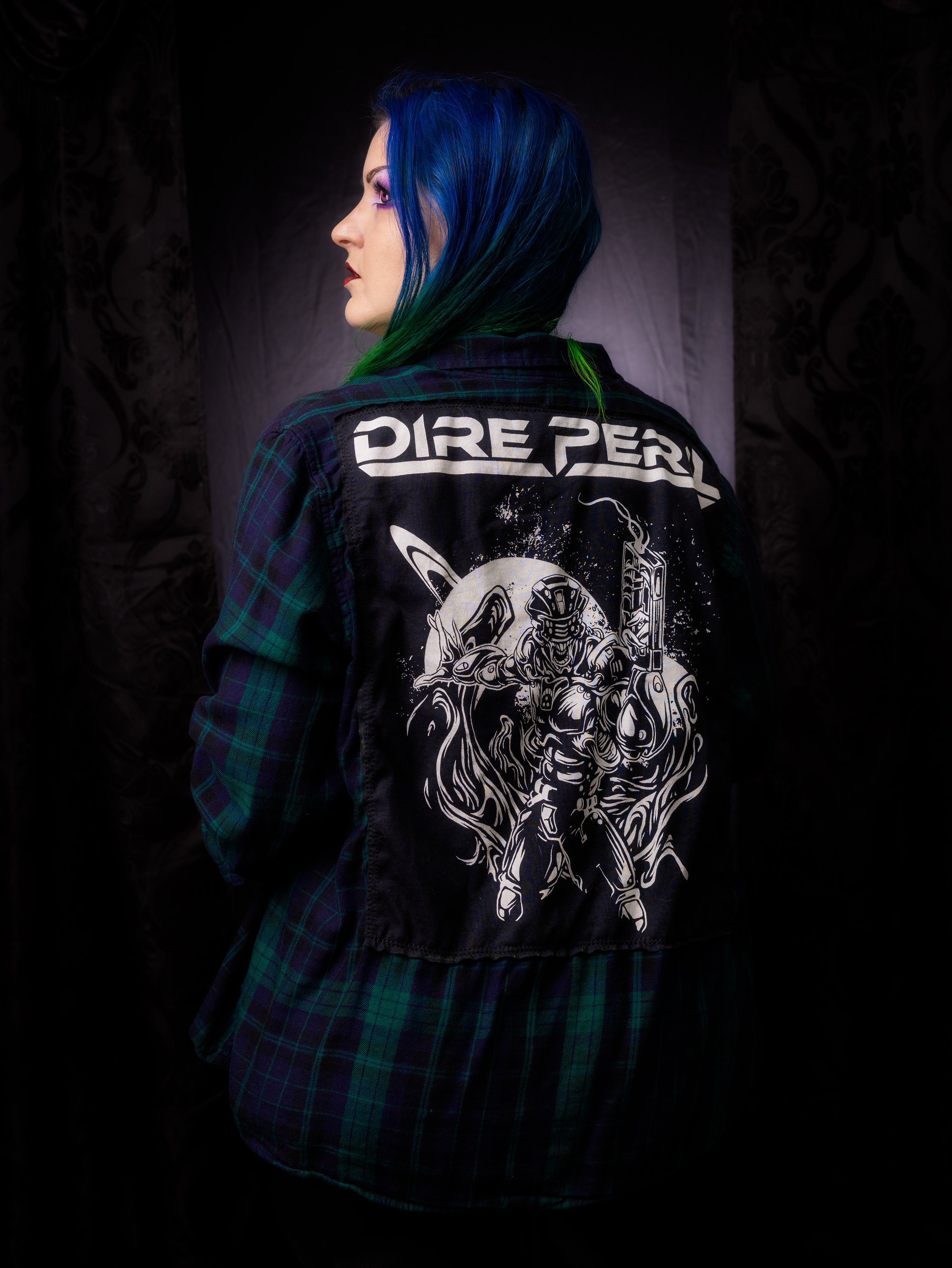 I made this using a thrifted flannel and a brand new, officially licensed Dire Peril tee. Lightweight flannel material, the brand is GAP and the colors are greens and blues.