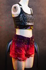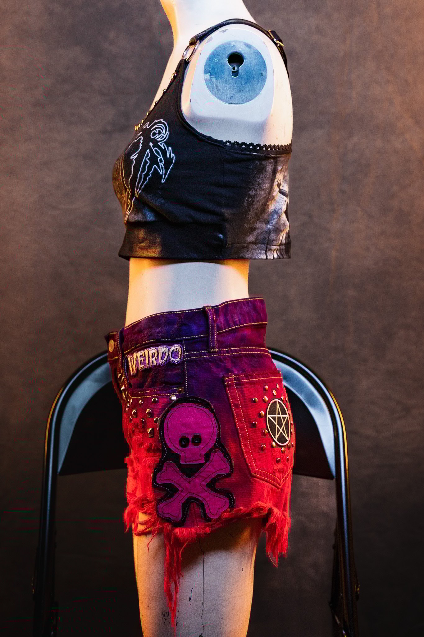 I made this from a previously owned pair of denim shorts. I dyed them using high quality dyes from Dharma Trading co. I studded them up for an extra cute, pastel goth look. I also added a bucnh of cute patches.