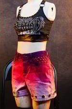 I made this from a previously owned pair of denim shorts. I dyed them using high quality dyes from Dharma Trading co. I studded them up for an extra cute, pastel goth look.