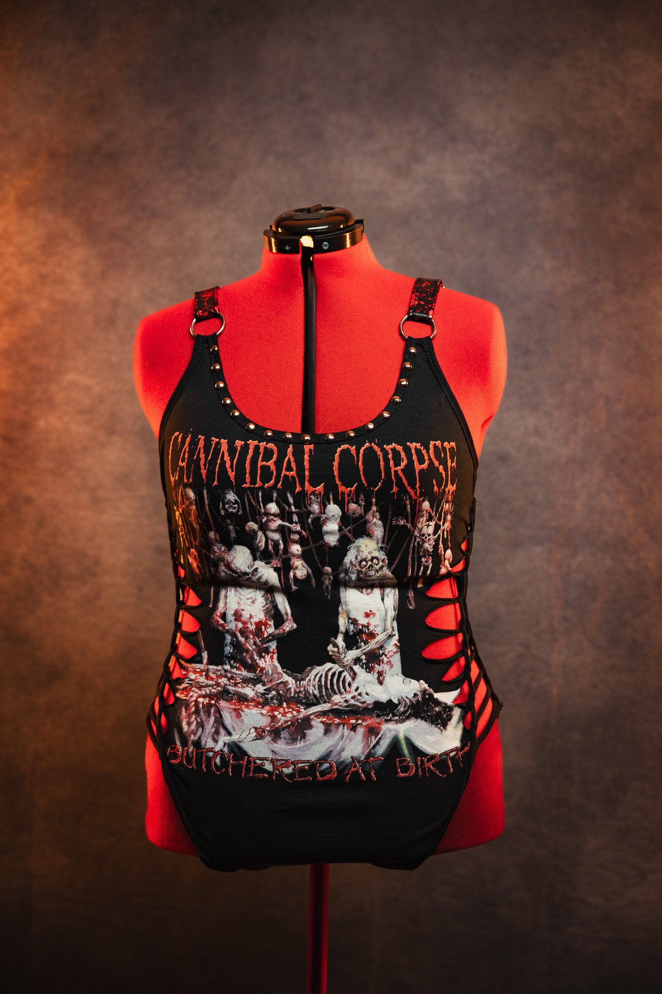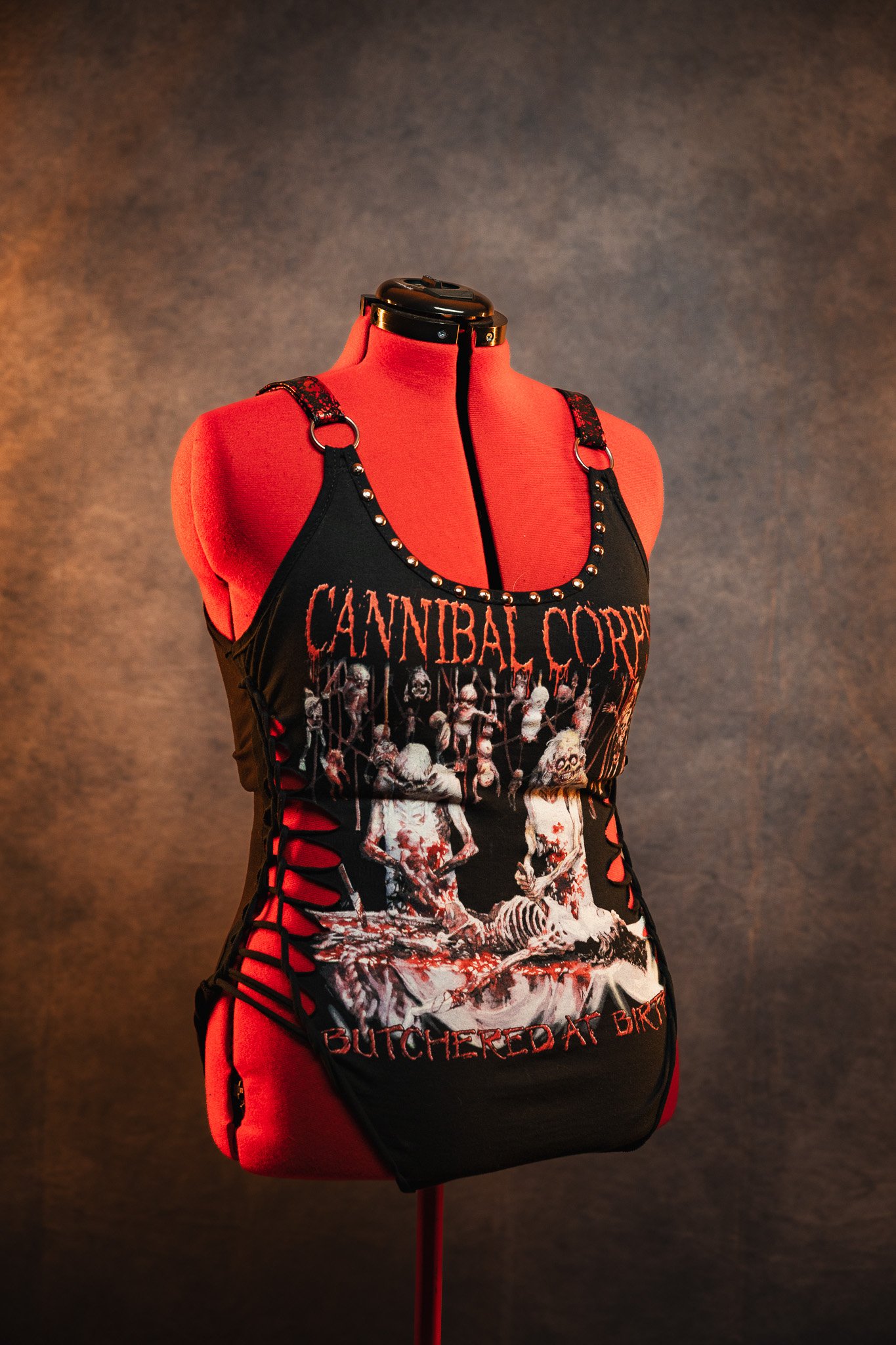 Made using a brand new, officially licensed Cannibal Corpse tee. Cut and sewn into a sexy bodysuit with slashes all over, studded neckline, and shiny blood splattered straps that are also adjustable. snaps at crotch.