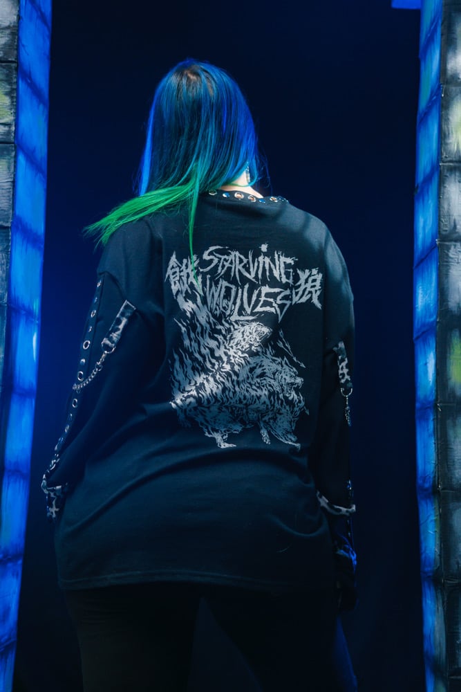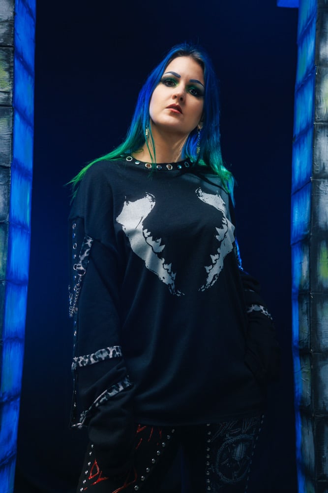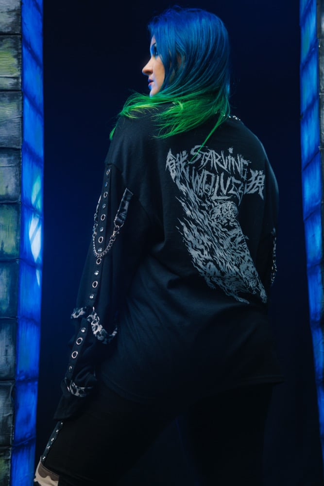 I made this from a brand new, officially licensed Starving Wolves tee. I add soft sweater sleeves with straps made from grey leopard print and black fabric. I accented this pieces with o rings and various hardware along the sleeves, straps, and neckline. Made using a men’s xl tee.