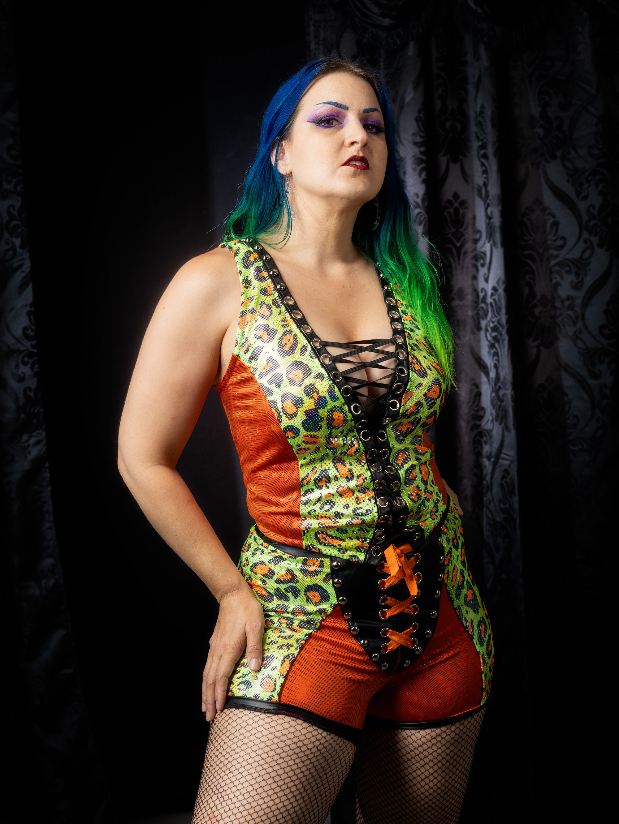 Both of these pieces are perfect for extra curvy bodies! Bold colors and figure flattering accents make this perfect for the wrestling ring or a concert or rave.