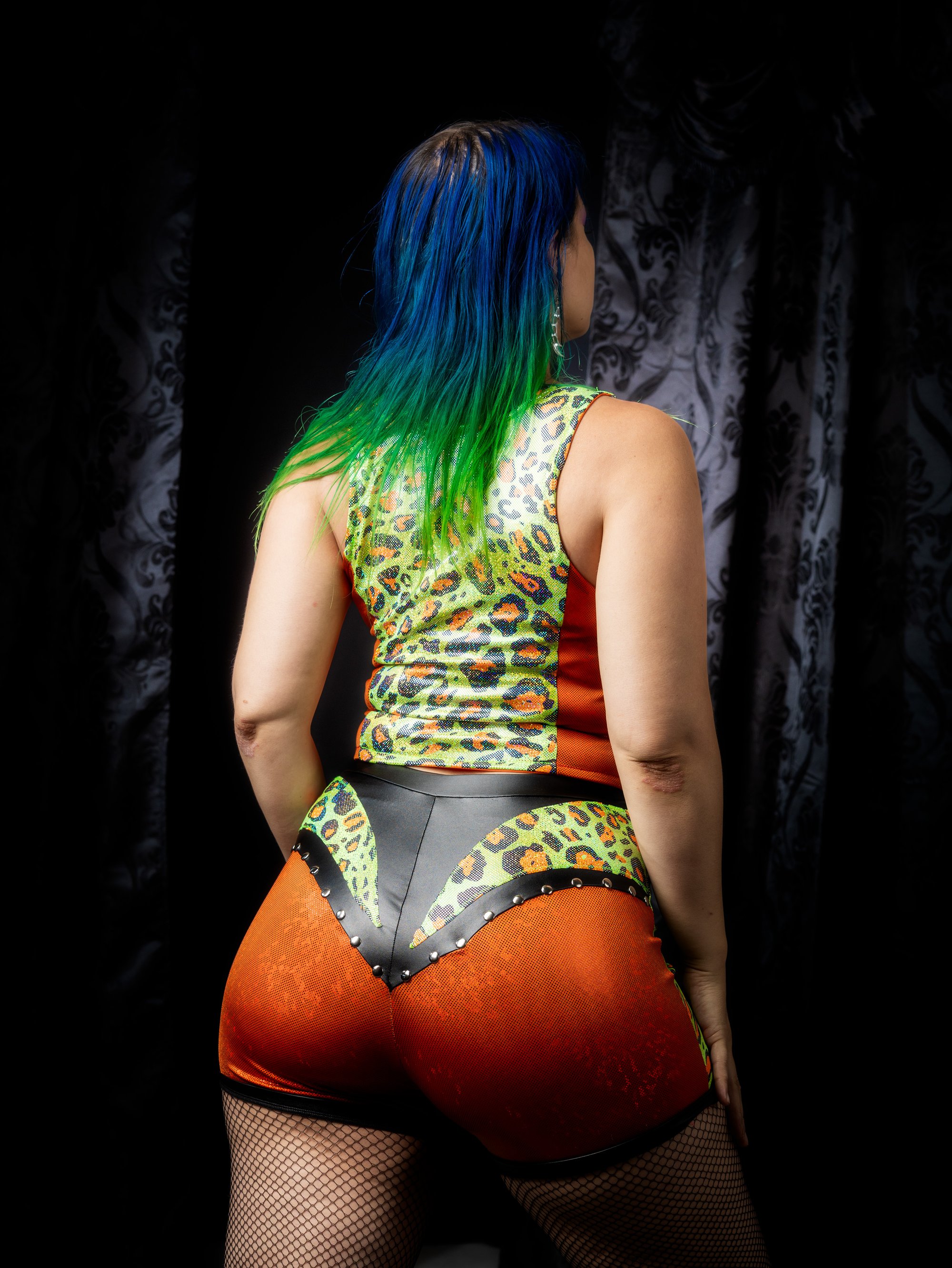 The shorts are made using the orange spandex as a base with panels of green leopard print at the sides in front. The back features a faux leather panel to contour the shape of the booty and accents of metal rivets and panels of green leopard spandex. I added a faux leather lace up crotch and faux leather finish at the hem of the shorts. High waisted and super stretchy with an elastic waistband.
