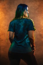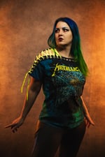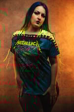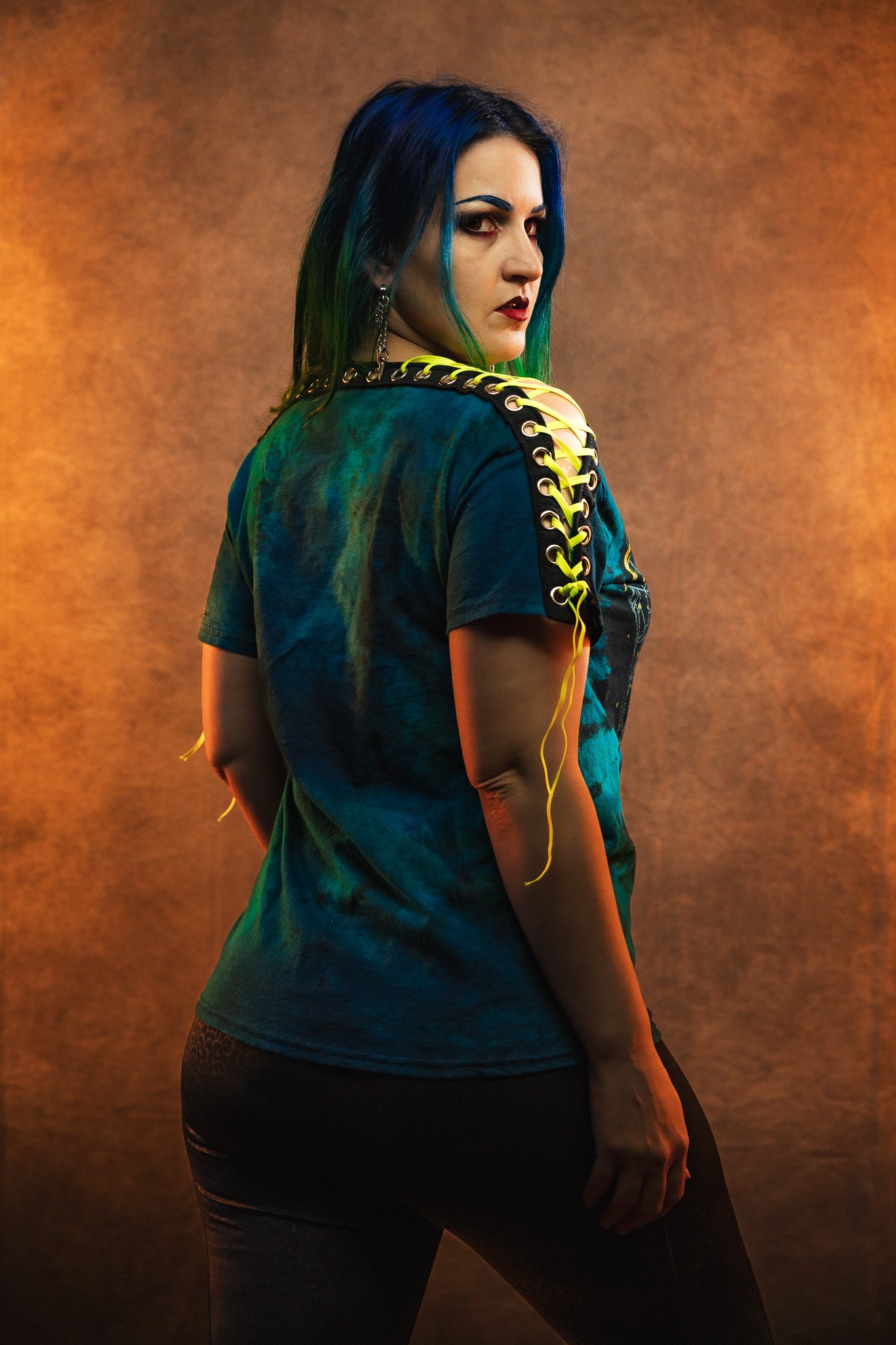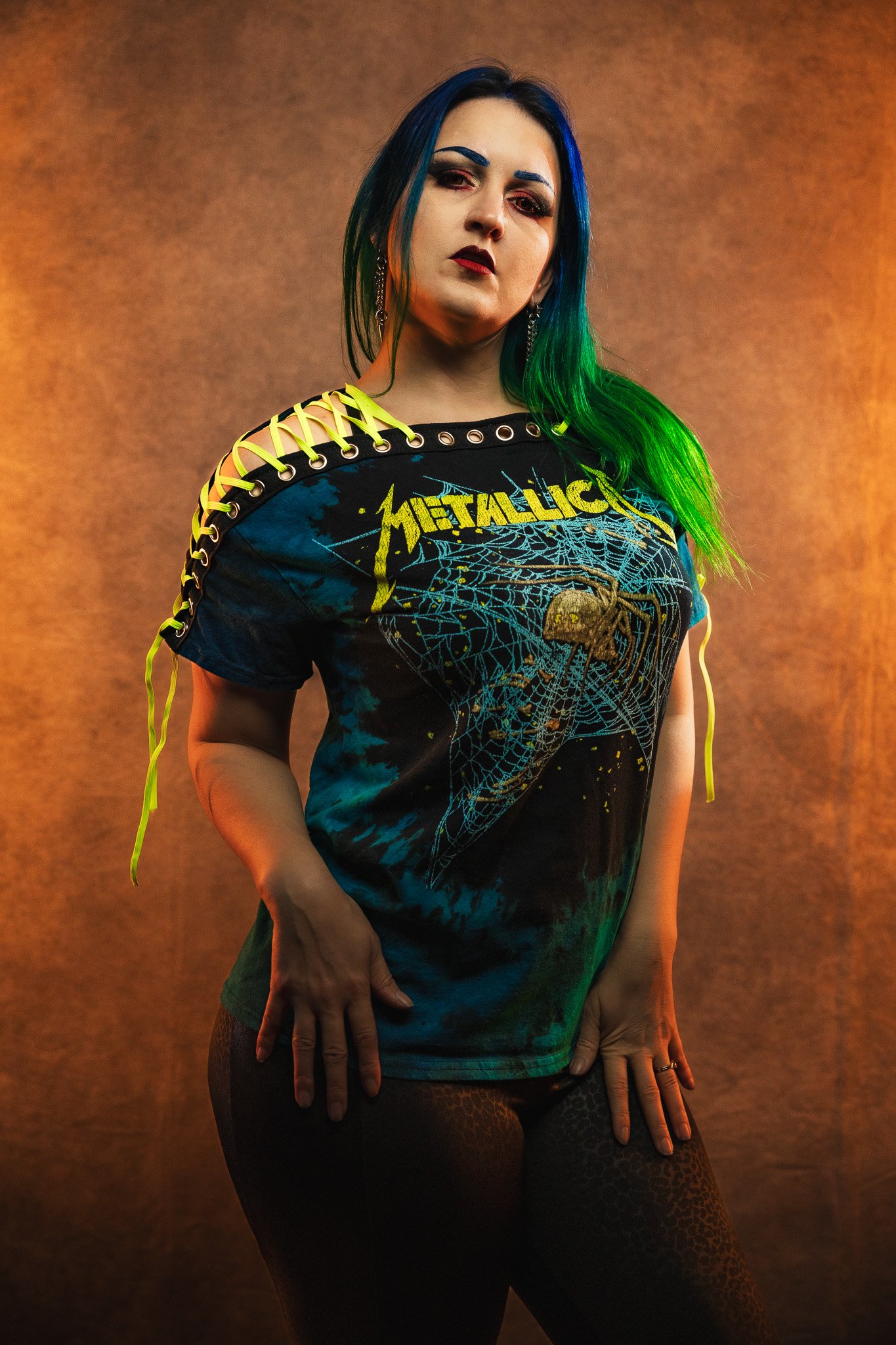 Made from a brand new, officially licensed Metallica tee. I reverse tie dyed the shirt using high quality dyes from Dharma Trading Co. Then i sewed it into a cute little off the shoulder tee with eyelets and bright yellow elastic. Made from a unisex medium tee.