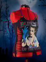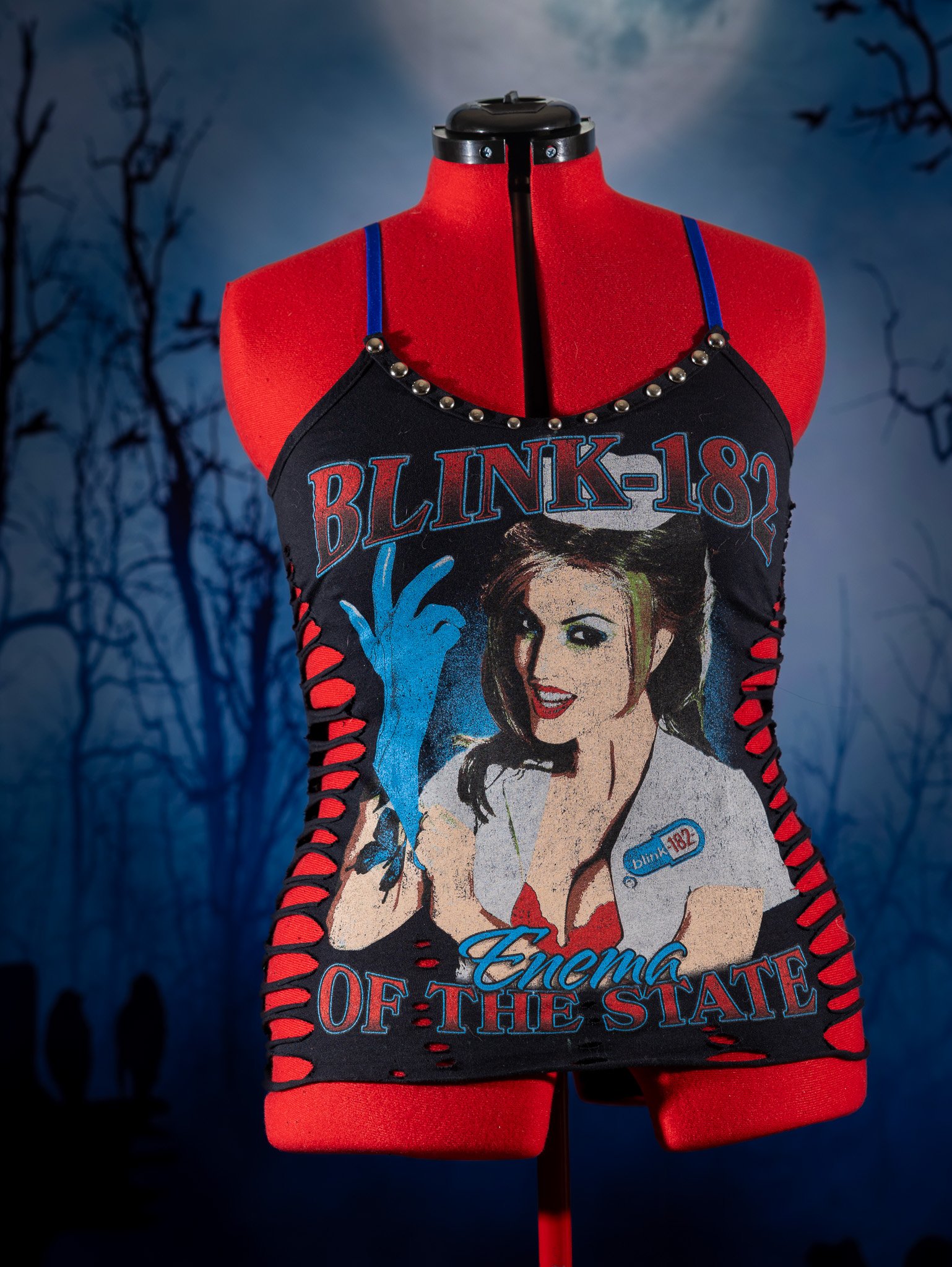This listing is for one Blink 182 I made this using a brand new, officially licnesed Blink 182 shirt. I added blue elastic straps with adjustable sliders. I accented the bust with silver colored metal rivets and gave it slashes up the sides.