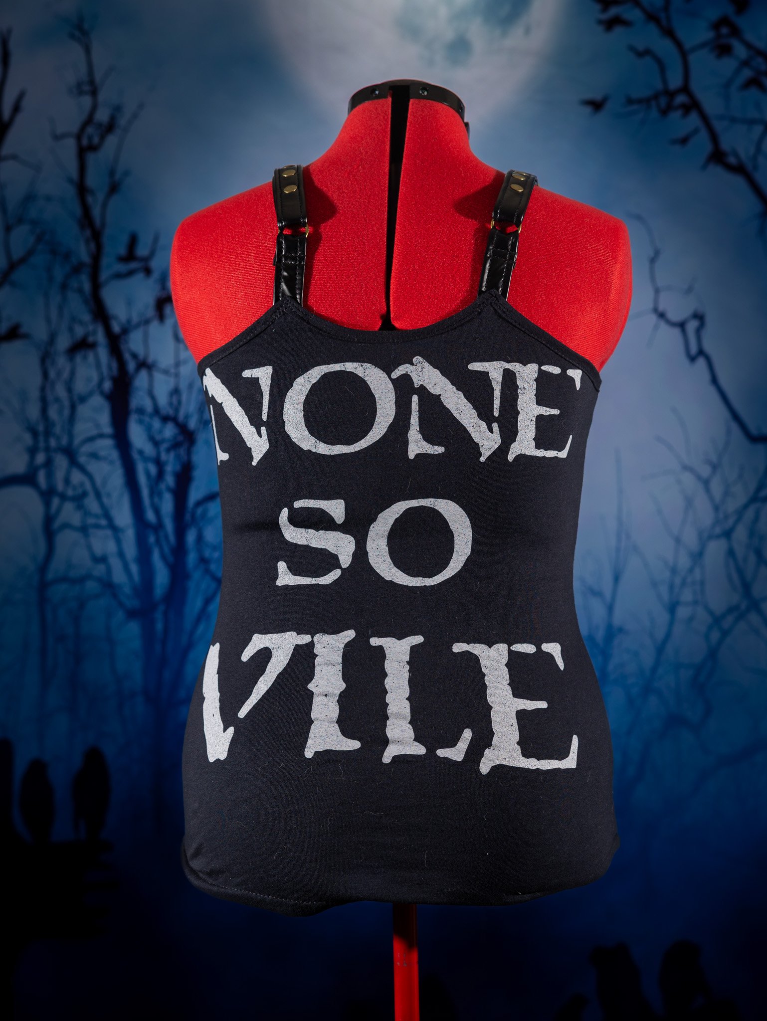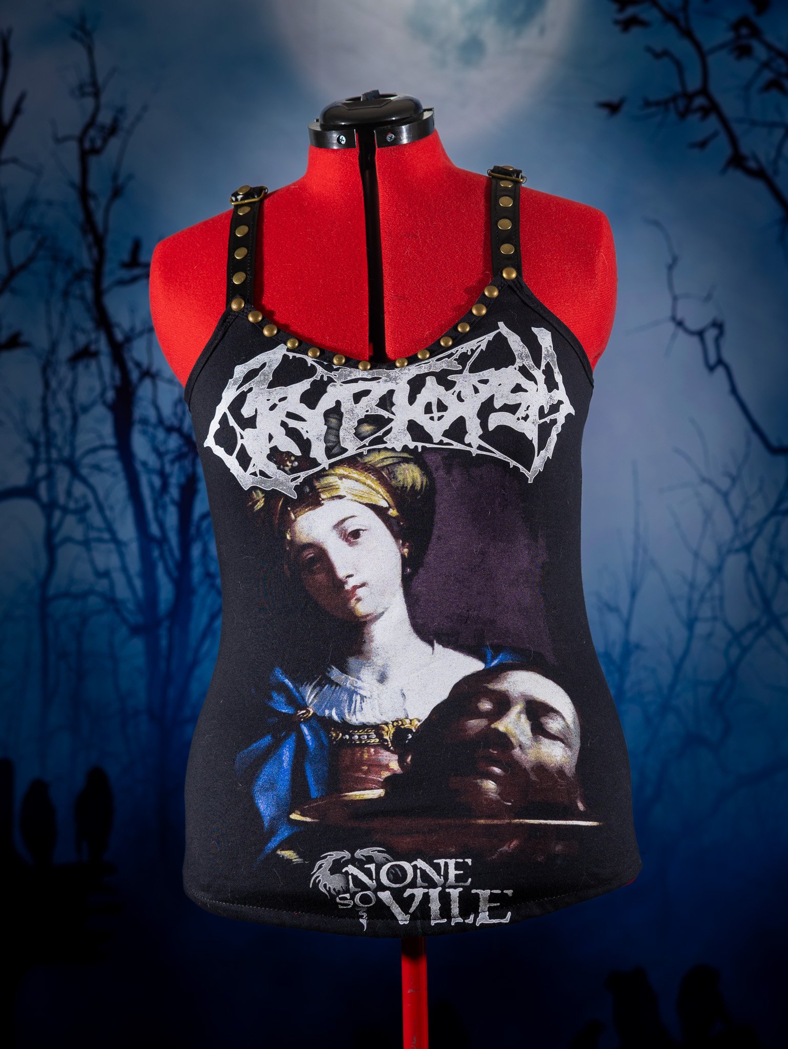 This listing is for one Cryptopsy tank top. I made this using a brand new, officially licensed Cryptopsy shirt. I added faux leather straps. I connected the straps with metal o-rings and added metal sliders so the straps are adjustable. I accented the bust with brass colored metal rivets.