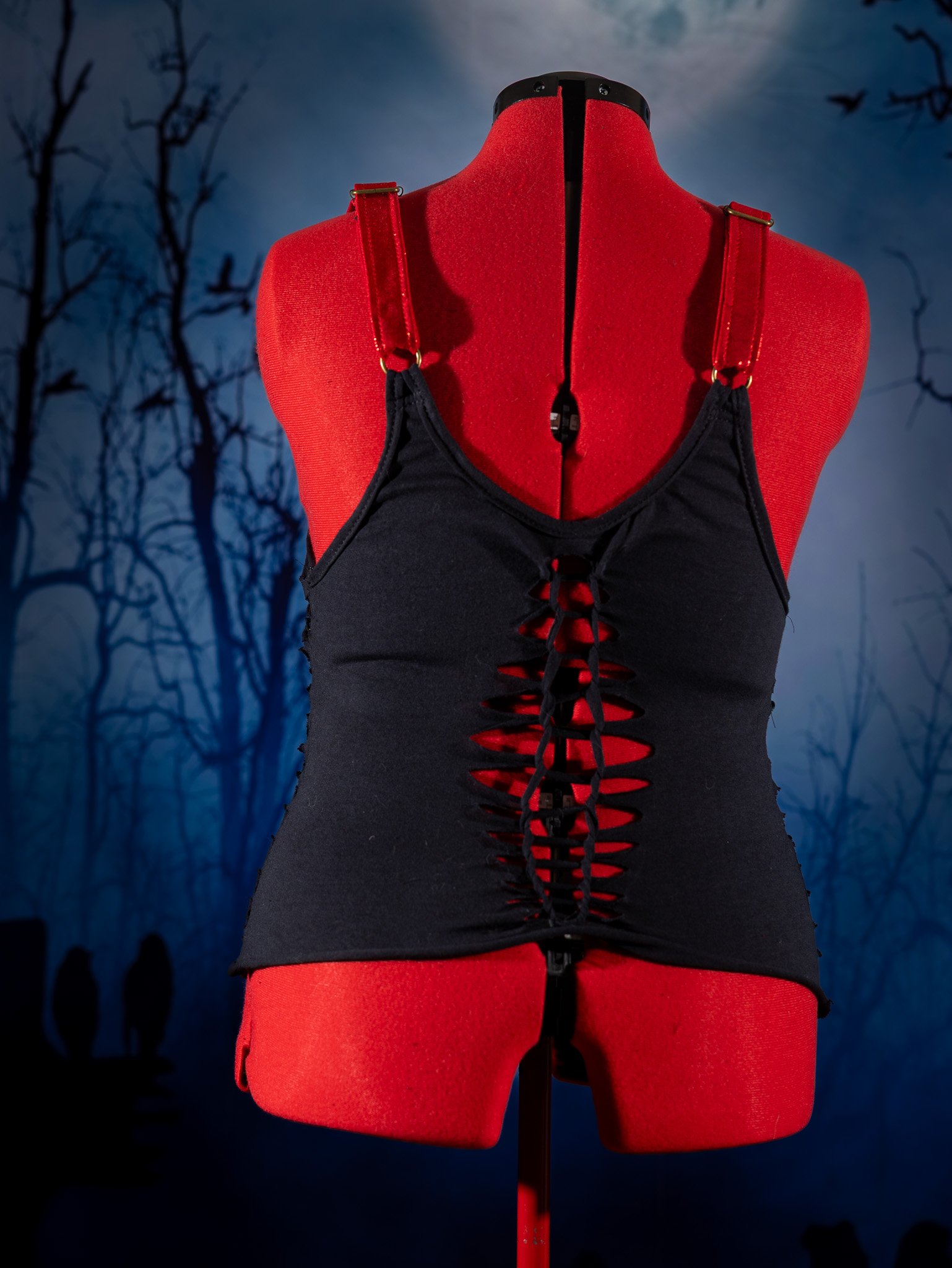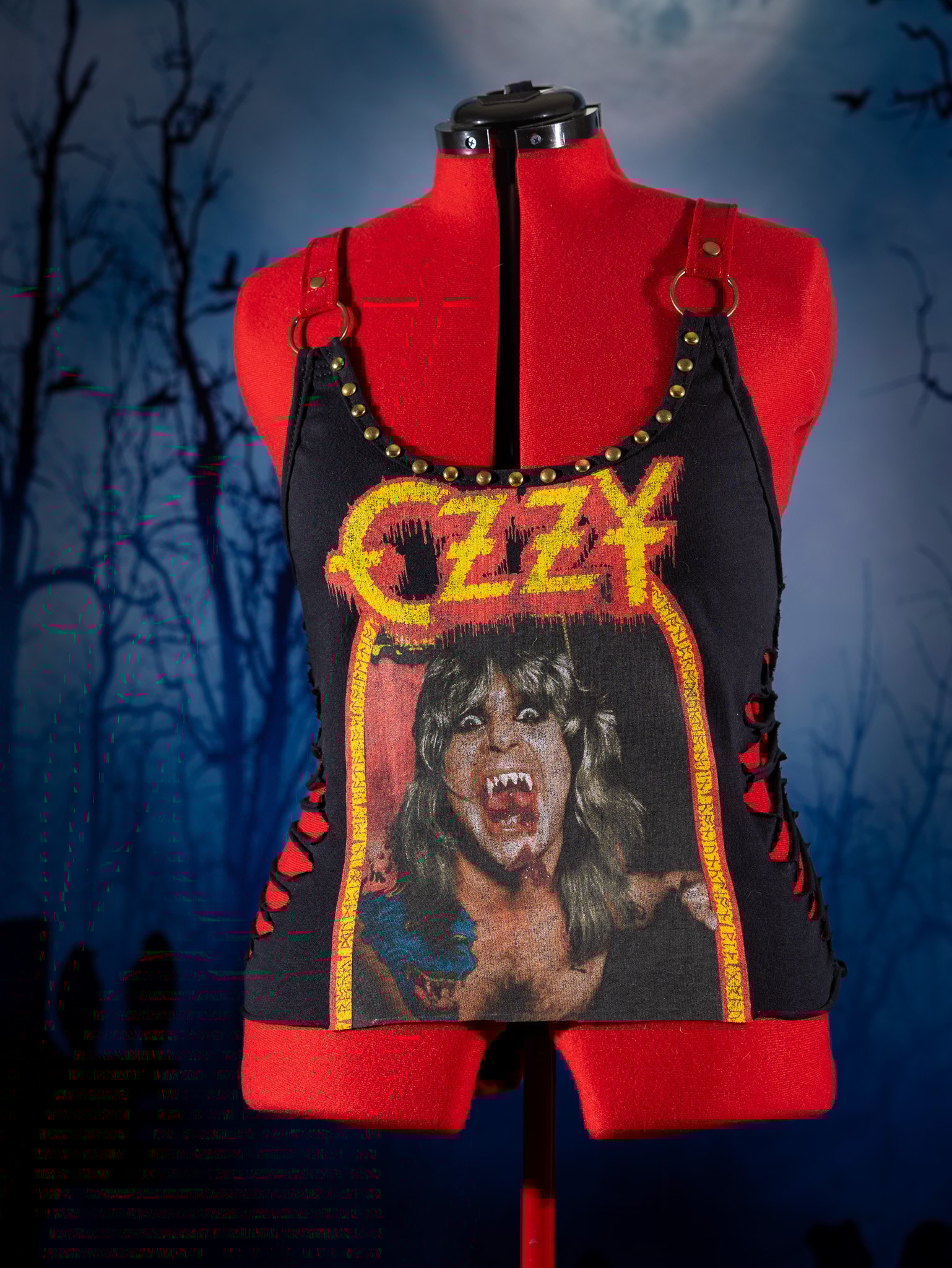 This listing is for one Ozzy tank top. I made this using a brand new, officially licnesed Ozzy Osbourne shirt. I added shiny red leather straps connected by metal o-rings with adjustable sliders. I accented the bust and straps with gold colored metal rivets. I added slashes along the sides for a sexy look. Will be a cropped fit.