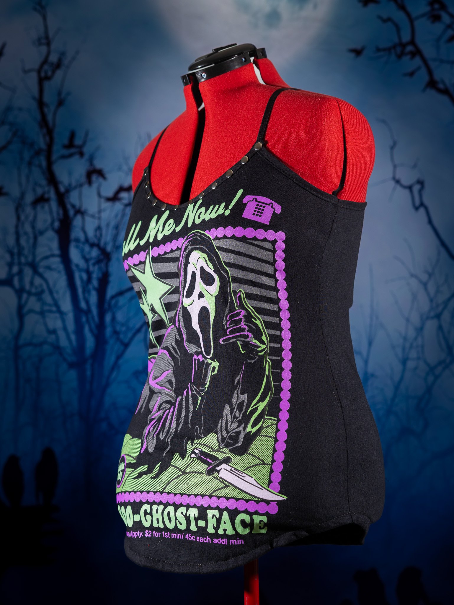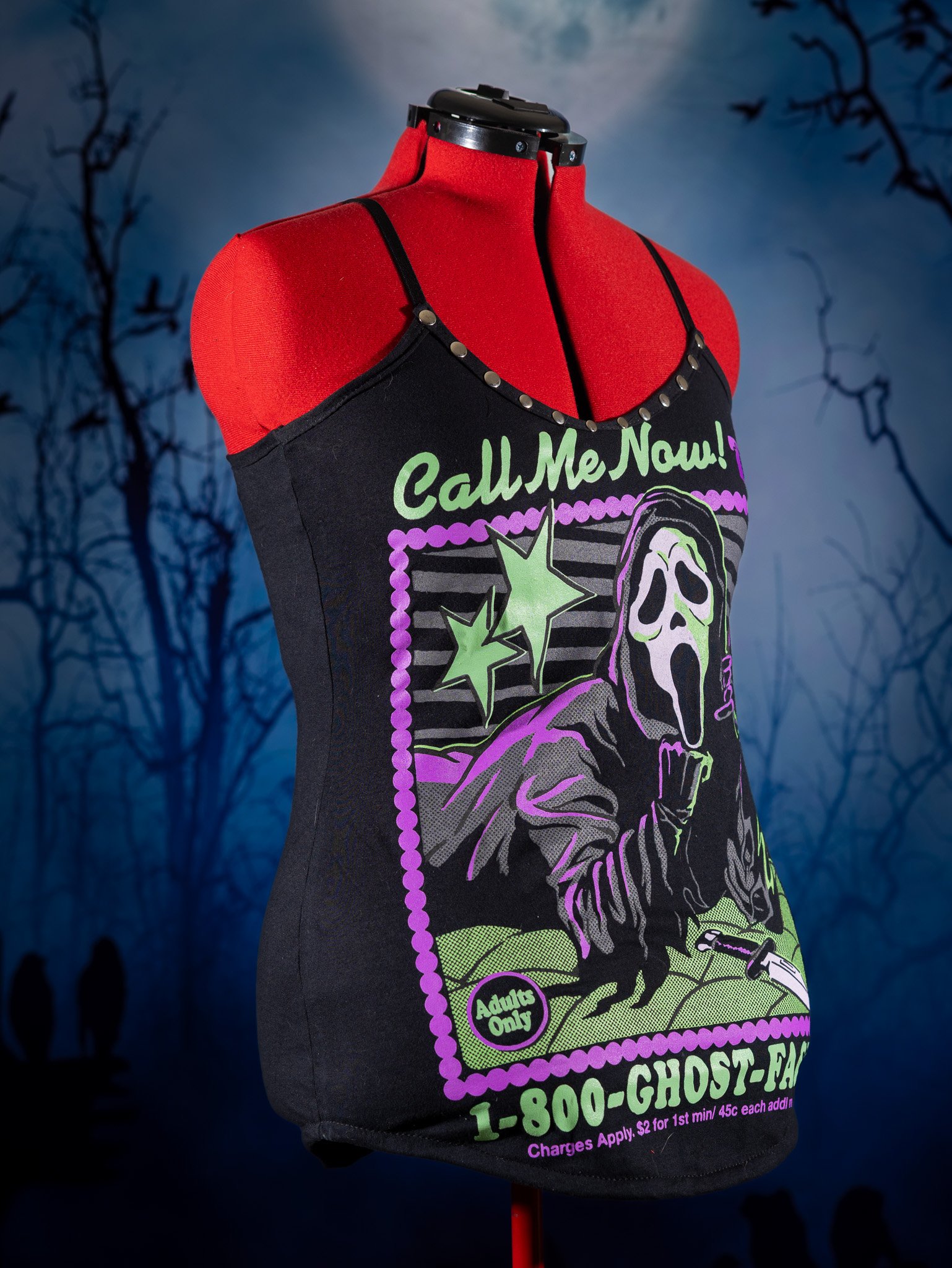 This listing is for one Scream tank top. I made this using a brand new, officially licensed Scream tee. I cut it into a cute little tank top and added spaghetti straps with adjustable sliders. I studded along the neckline with metal rivets.