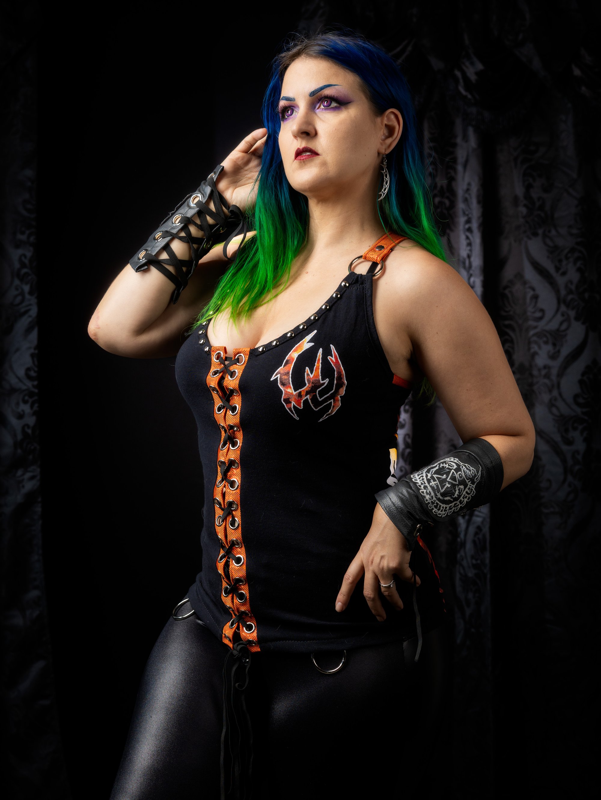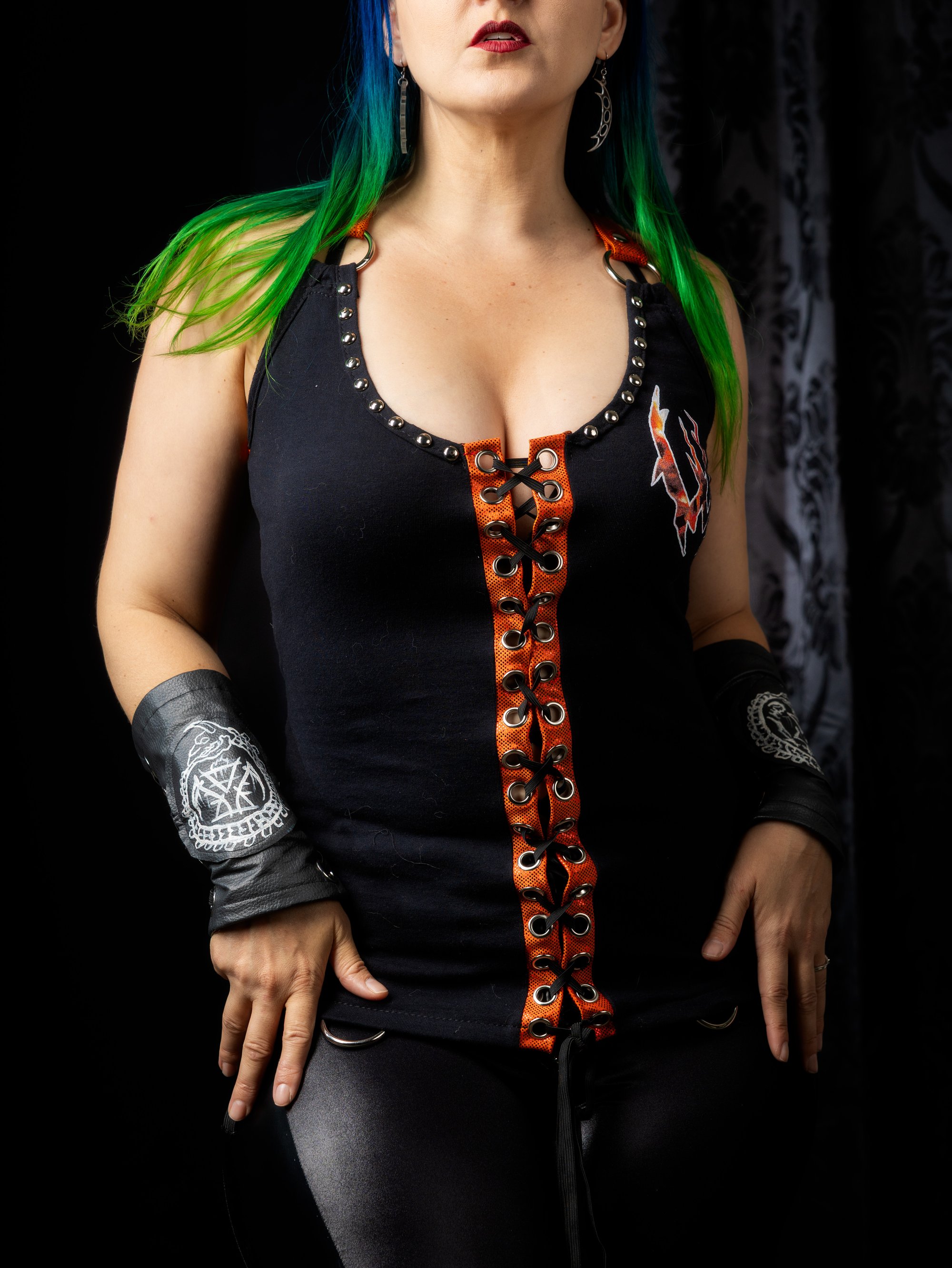 I made this using a brand new, officially licensed Wastewalker tee. I cut it into a cute little tank top with a sexy lace up panel up the front using shiny orange spandex fabric and metal eyelets. I studded the neckline and connected shiny orange straps connected by metal o-rings. The straps are adjustable with metal sliders. Larger sizes will have more skin showing between lace up panel.