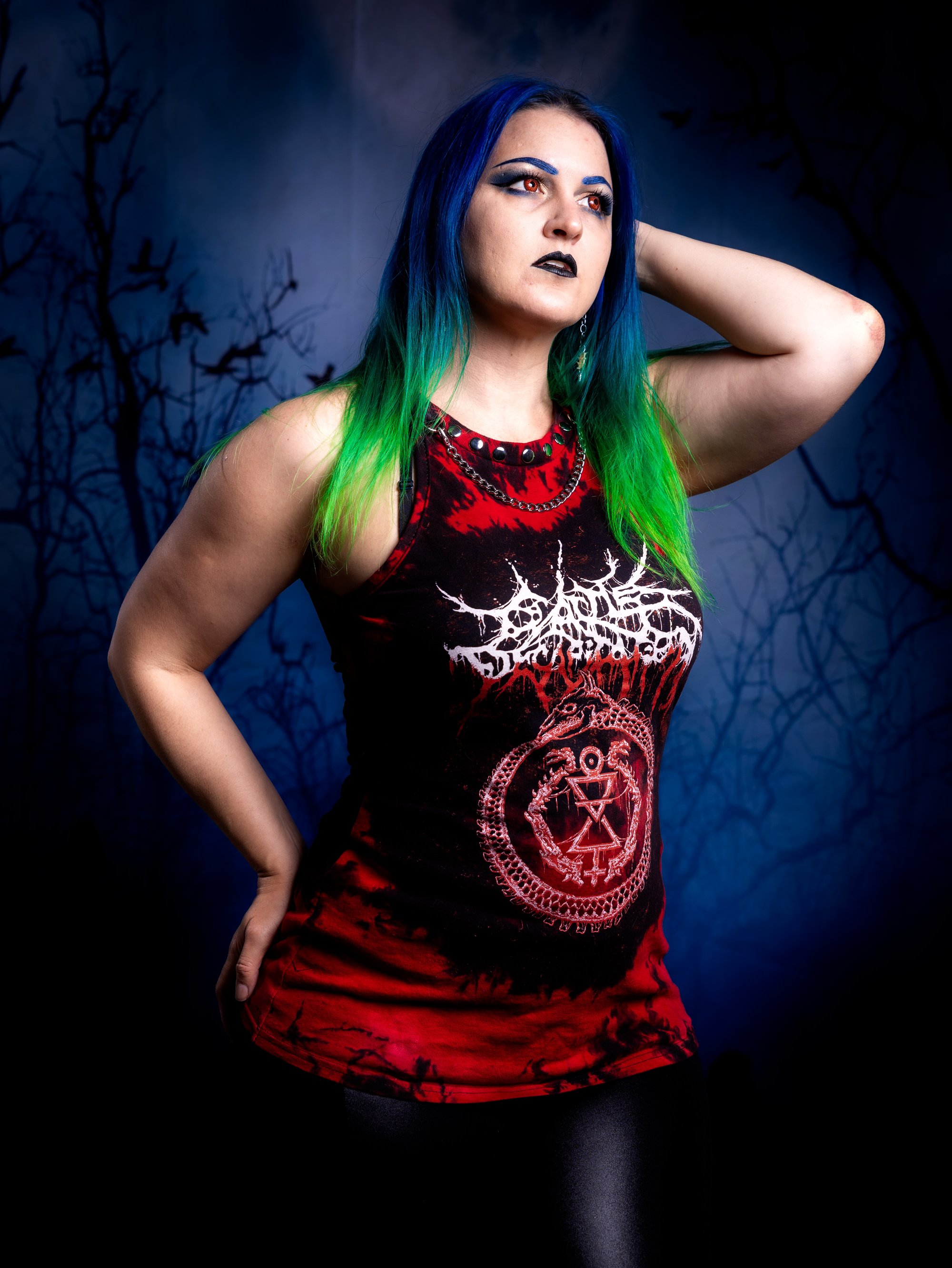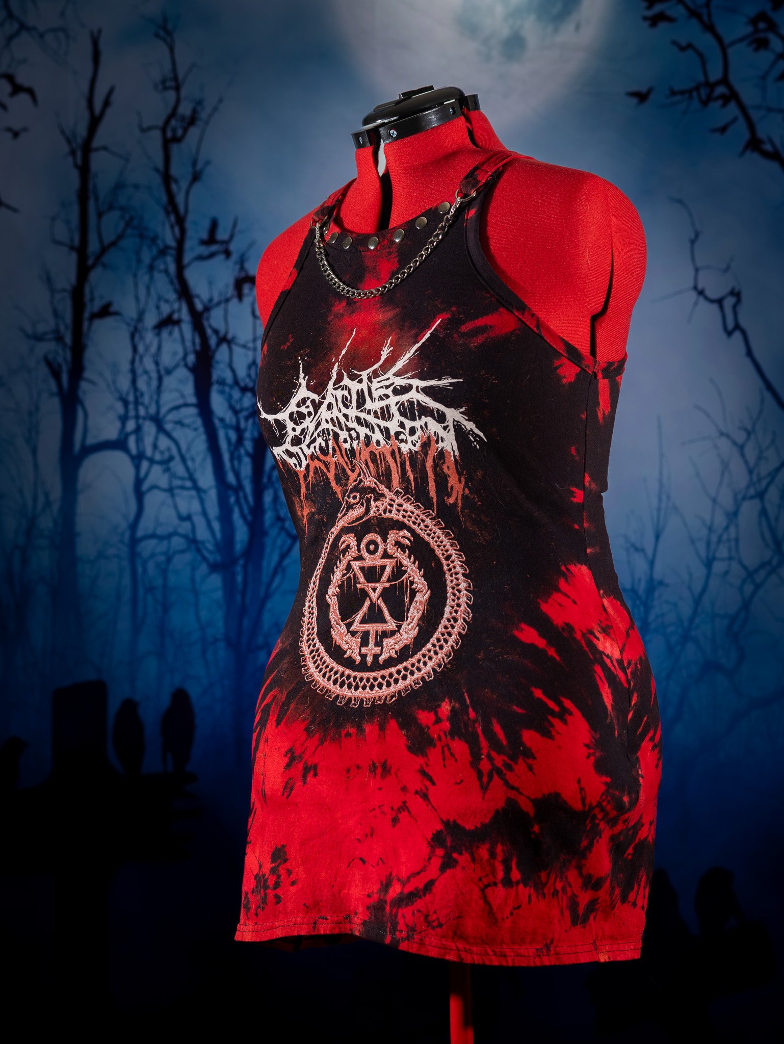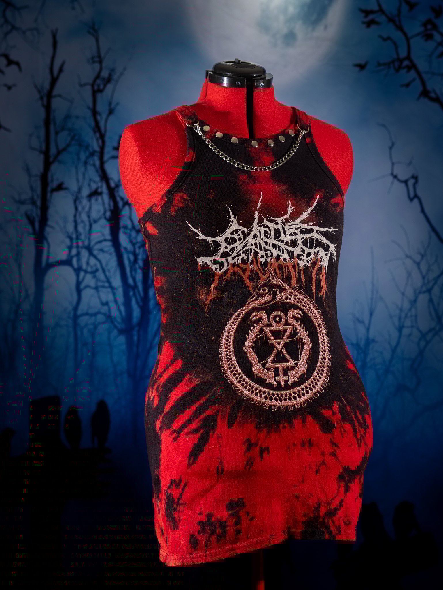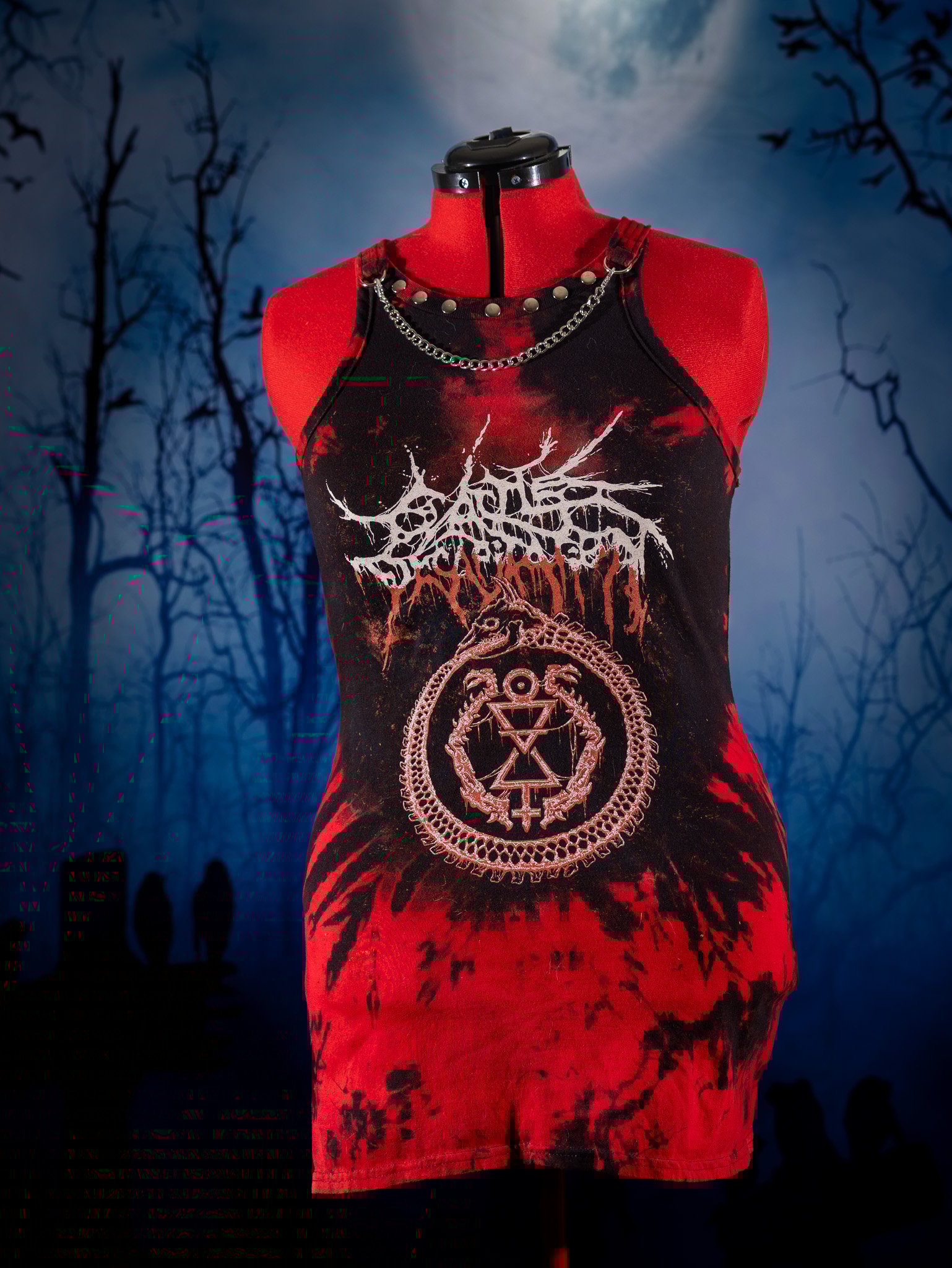 I made this using a brand new, officially licensed Cattle Decapitation tour tee. I cut it into a cute little high neck tank top. I gave the shirt a reverse tie dye using Rit color remover and high quality tie dyes from Dharma Trading Co. I also added metal o-rings in a silver colored finish and connected detachable silver colored chains. I also added silver colored metal rivets along the neckline. I made this item in 4 sizes (only one of each).