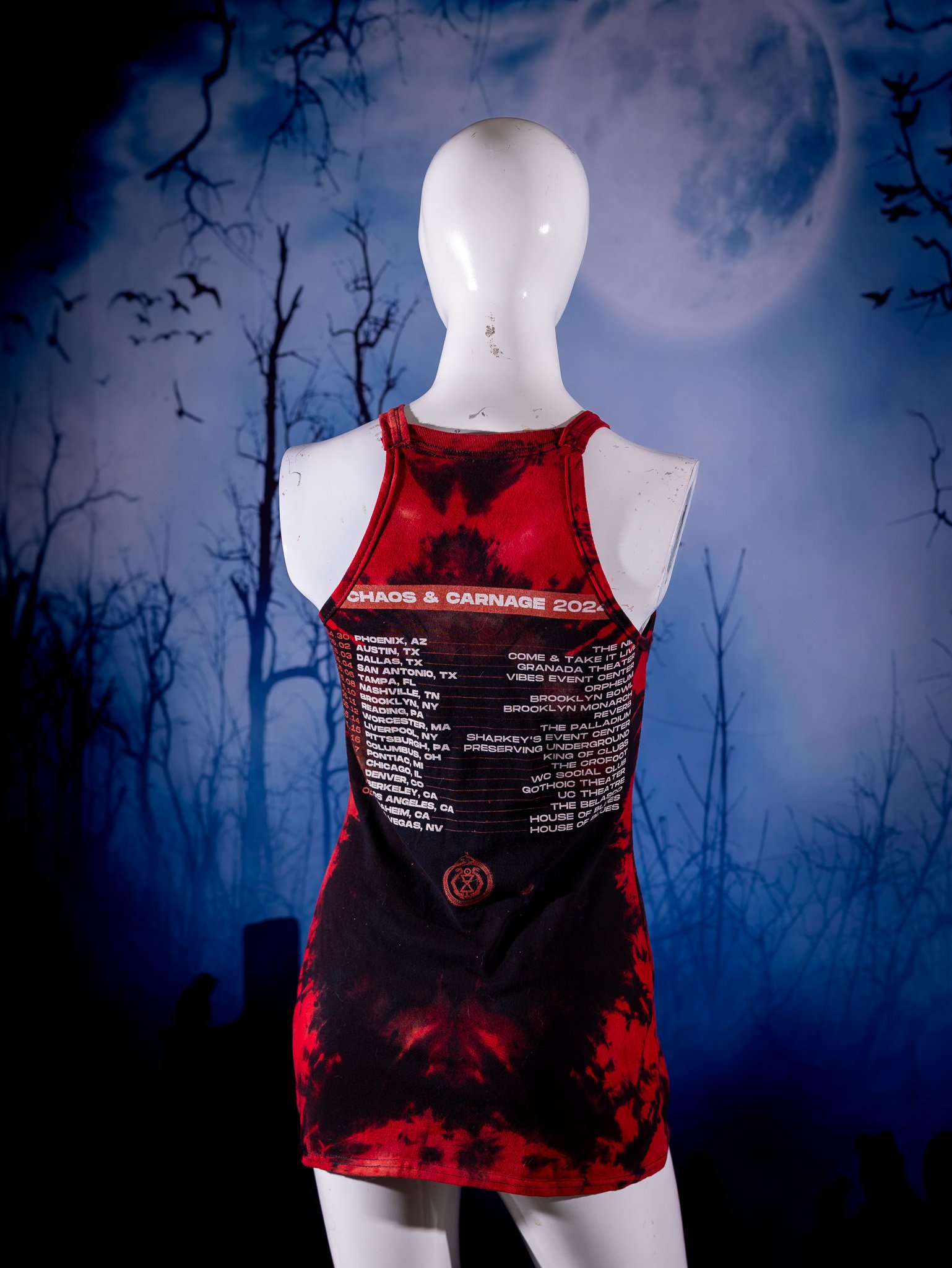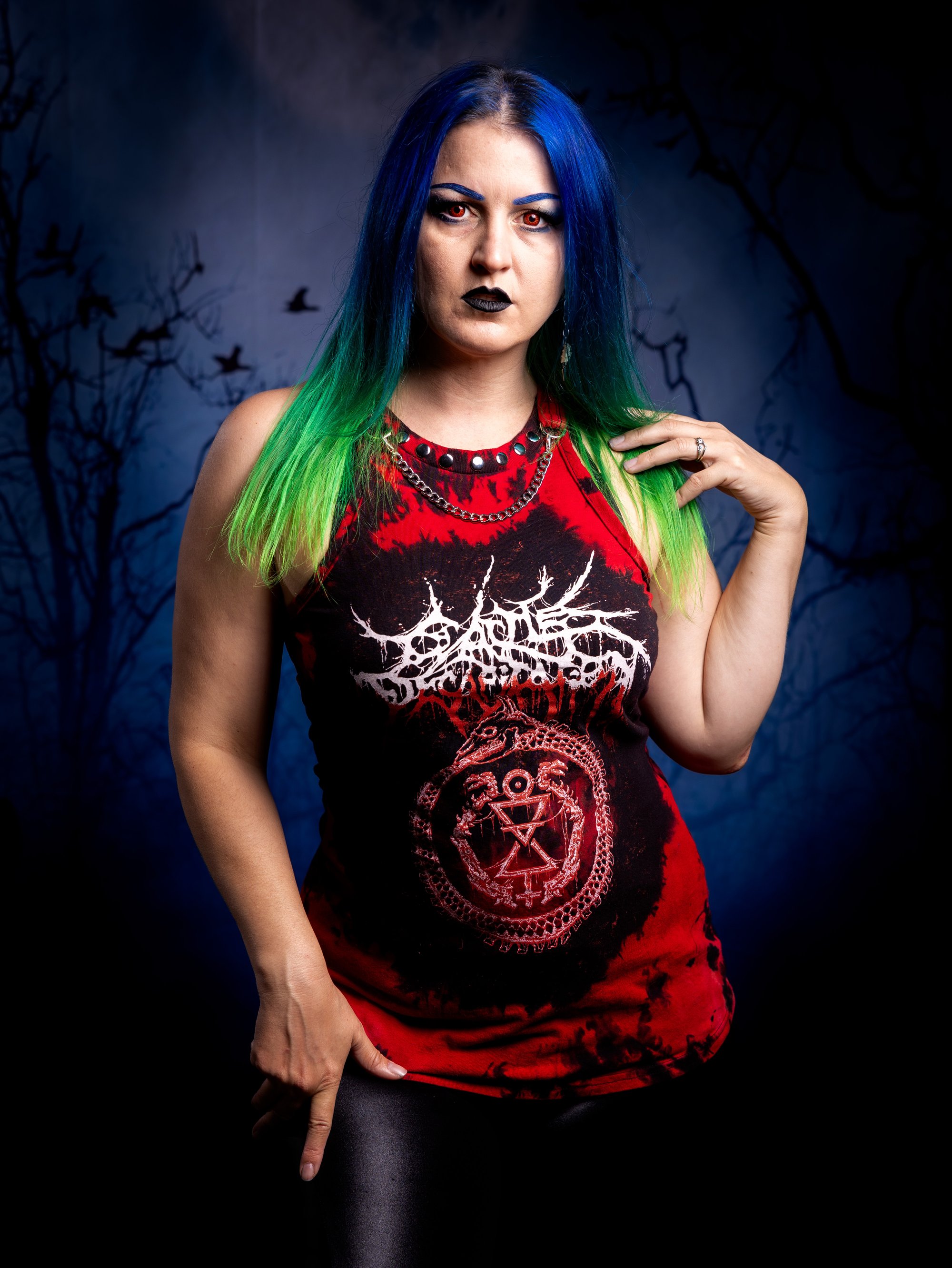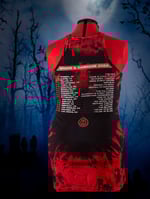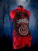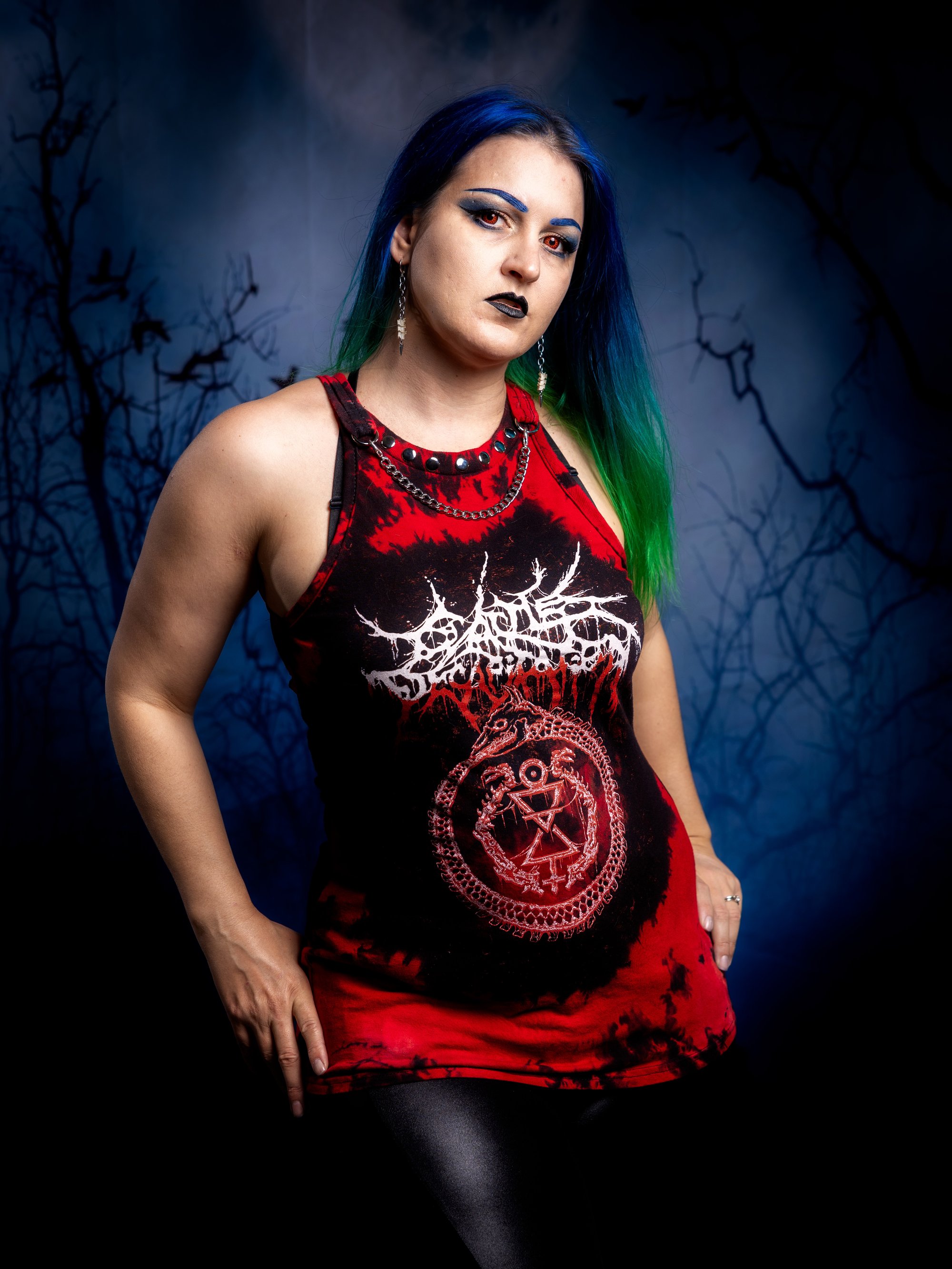 I made this using a brand new, officially licensed Cattle Decapitation tour tee. I cut it into a cute little high neck tank top. I gave the shirt a reverse tie dye using Rit color remover and high quality tie dyes from Dharma Trading Co. I also added metal o-rings in a silver colored finish and connected detachable silver colored chains. I also added silver colored metal rivets along the neckline. I made this item in 4 sizes (only one of each).