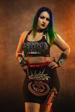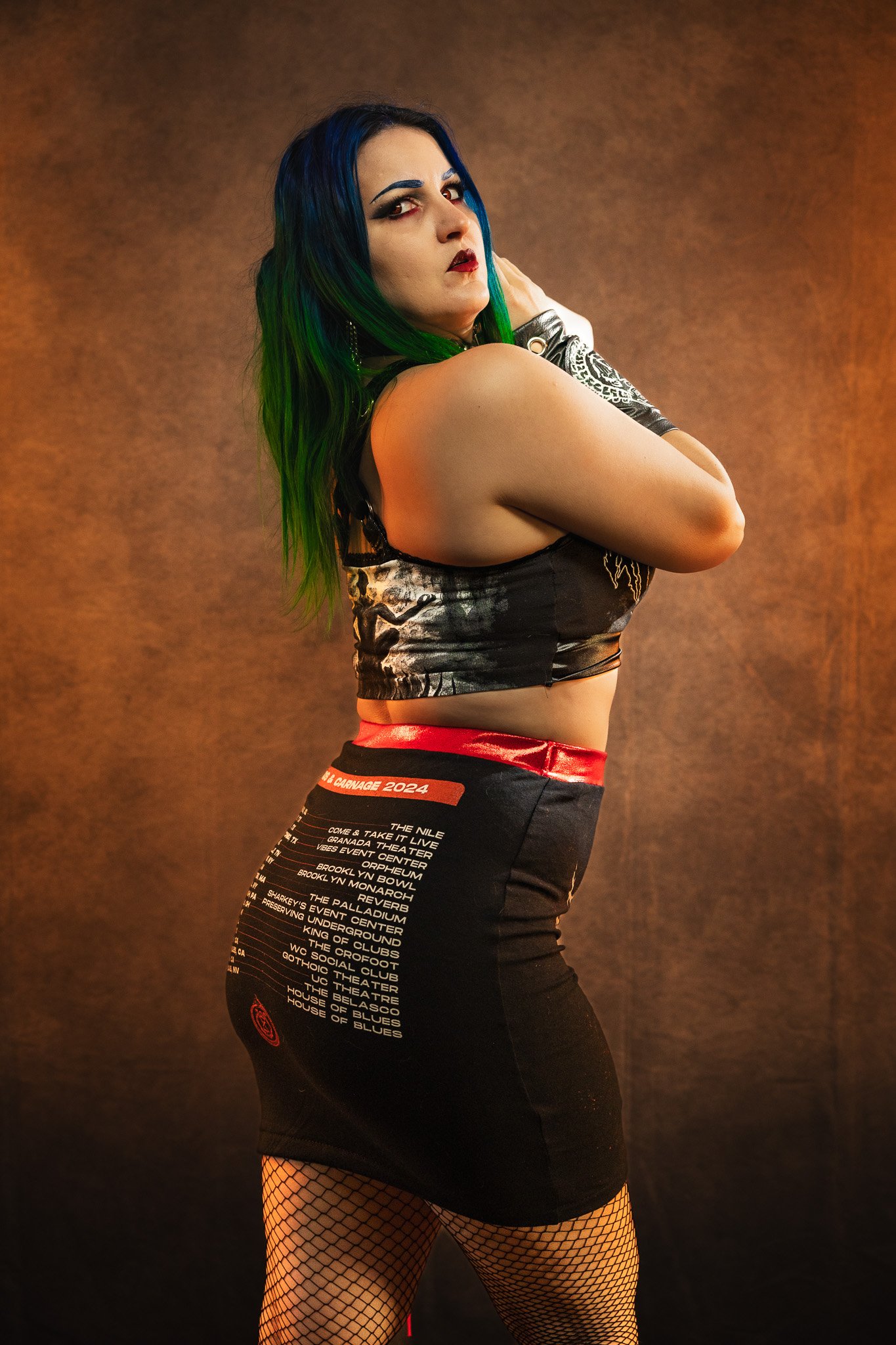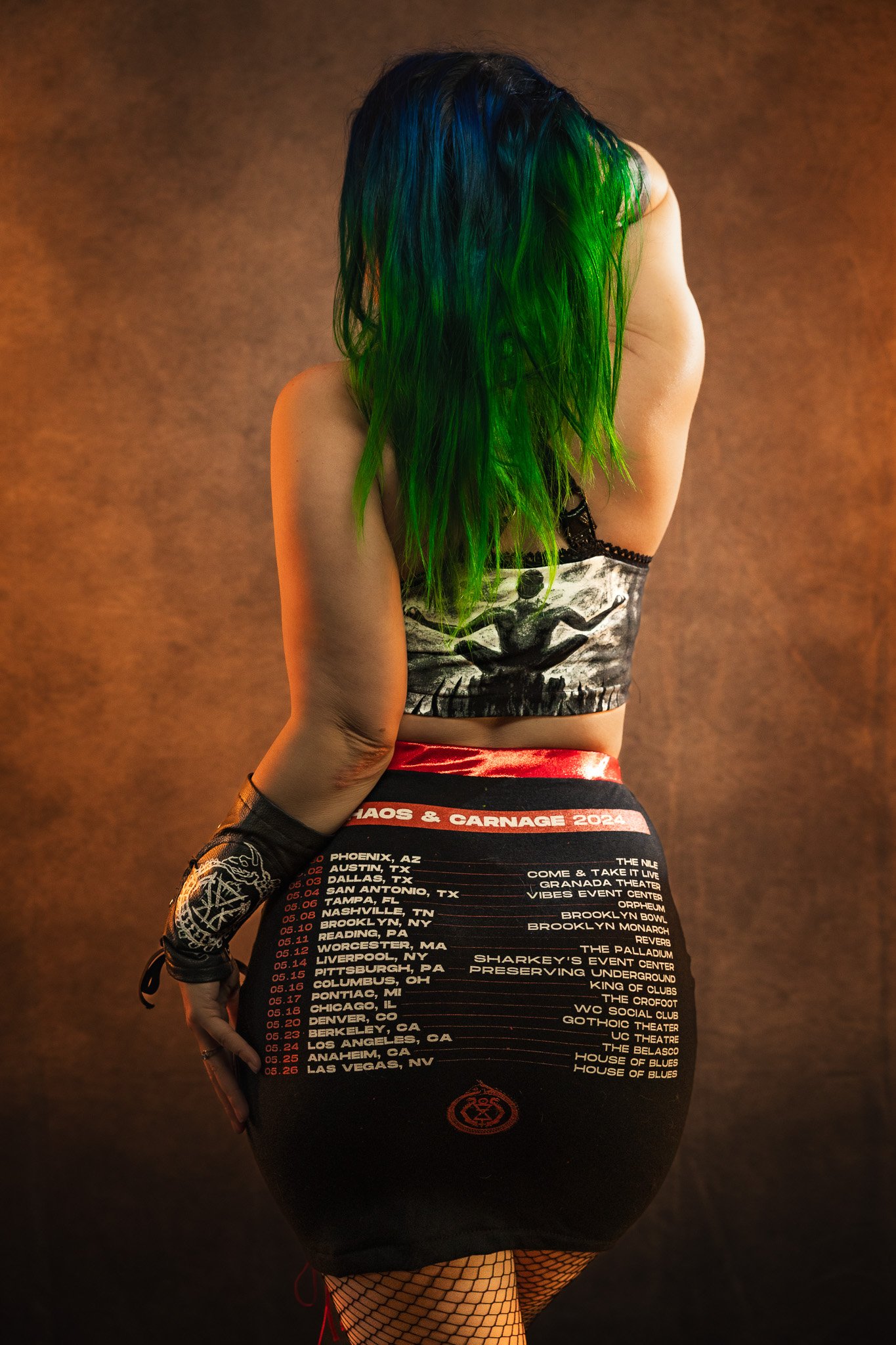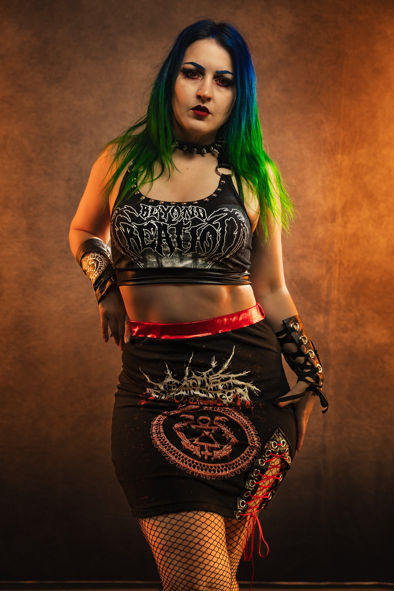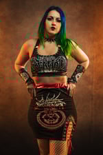 I made these using a brand new, officially licensed Cattle Decapitation tee. I made this in two different sizes. I cut and sewed it into a high waisted mini skirt with an elastic waistband inside red shiny spandex. I added a faux leather panel of eyelets for a sexy side slit and laced it up with red elastic.