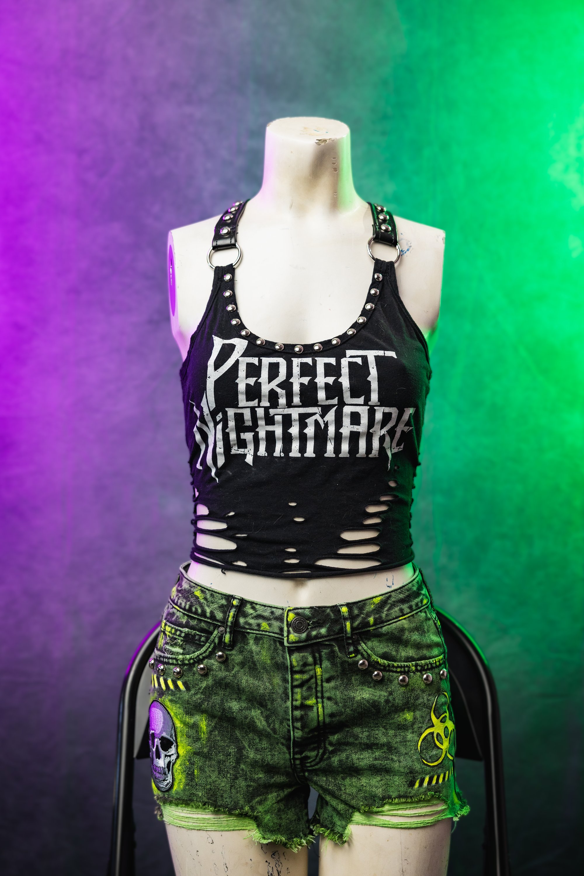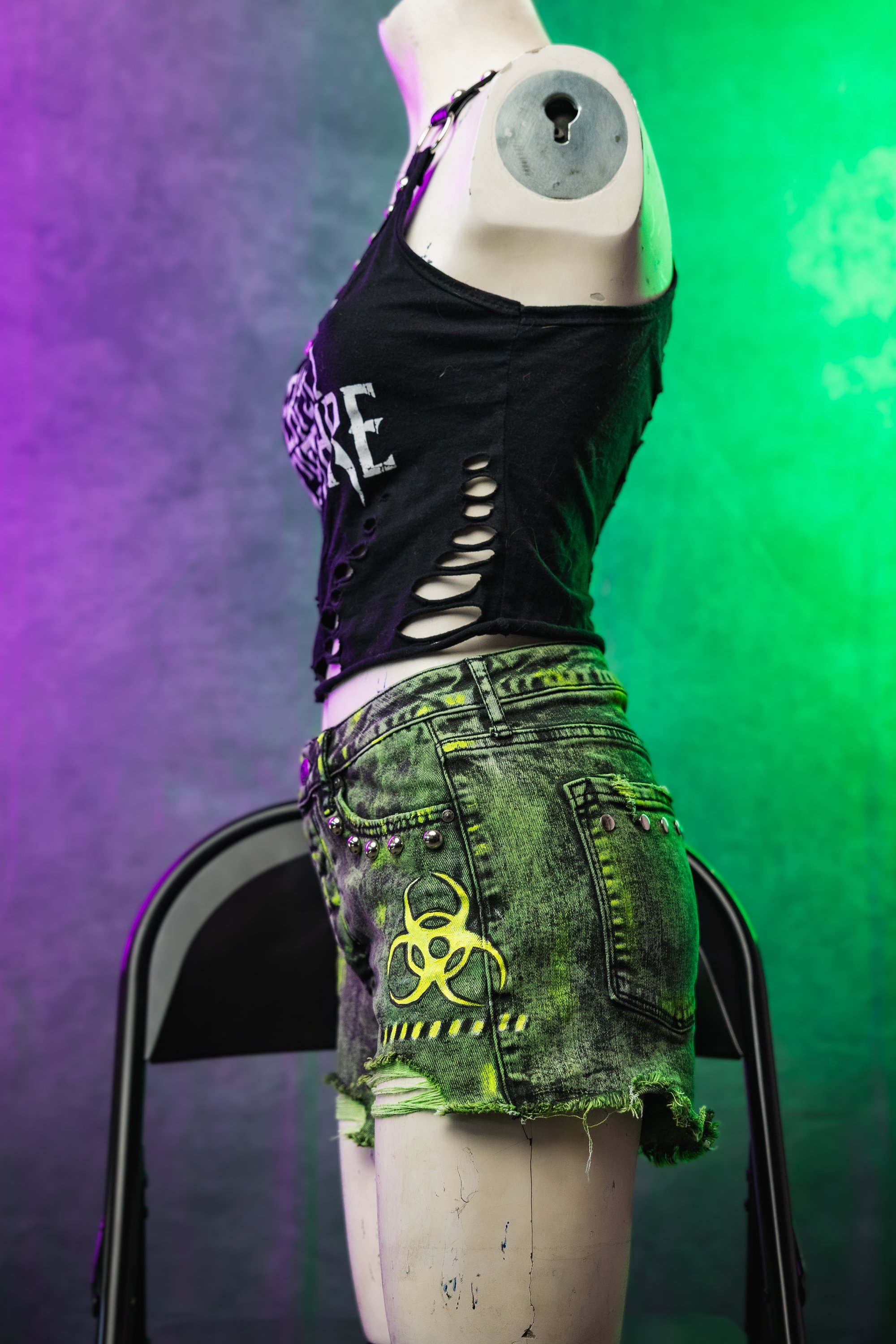 I made this from a previously owned pair of denim shorts. I dyed them using high quality dyes from Dharma Trading co. I added a skull patch and hand painted details for a radioactive themed look. I also added metal studs.