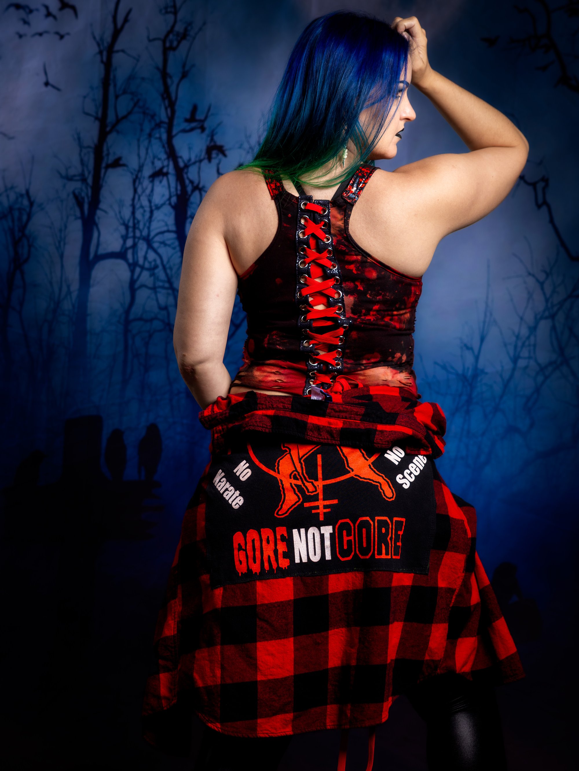 I made the flannel using a thrifted flannel (yay upcycling!) and sewed the back design onto the flannel. The back design features a Gore not Core logo with No Karate, No Comeovers, No Breakdowns, No Scene on the back.