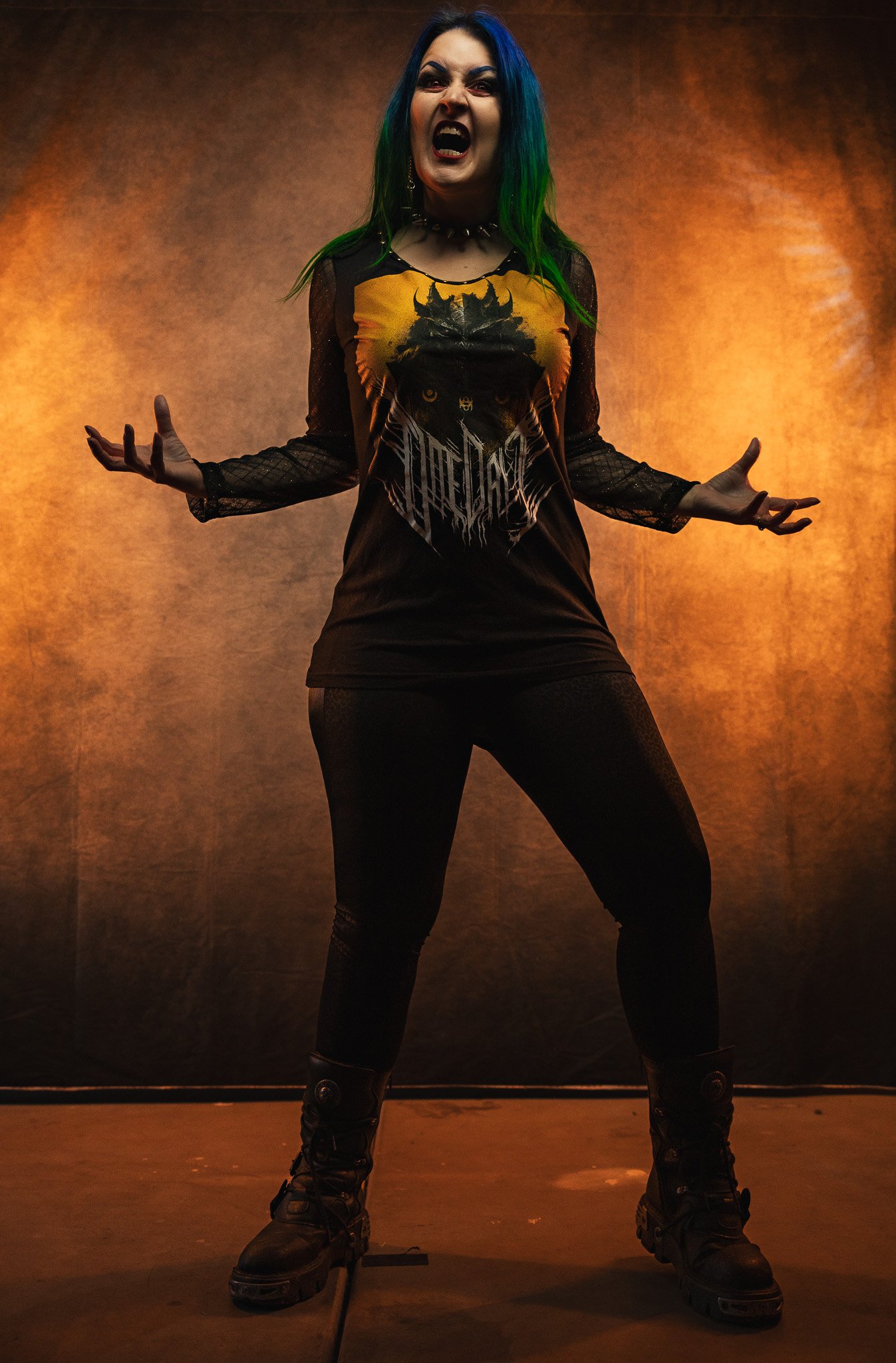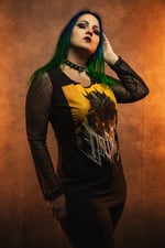 This was made using a brand new, officially licensed Daedric tee. I cut and sewed it into a cute longsleeve top with black and gold mesh sleeves and a studded neckline.
