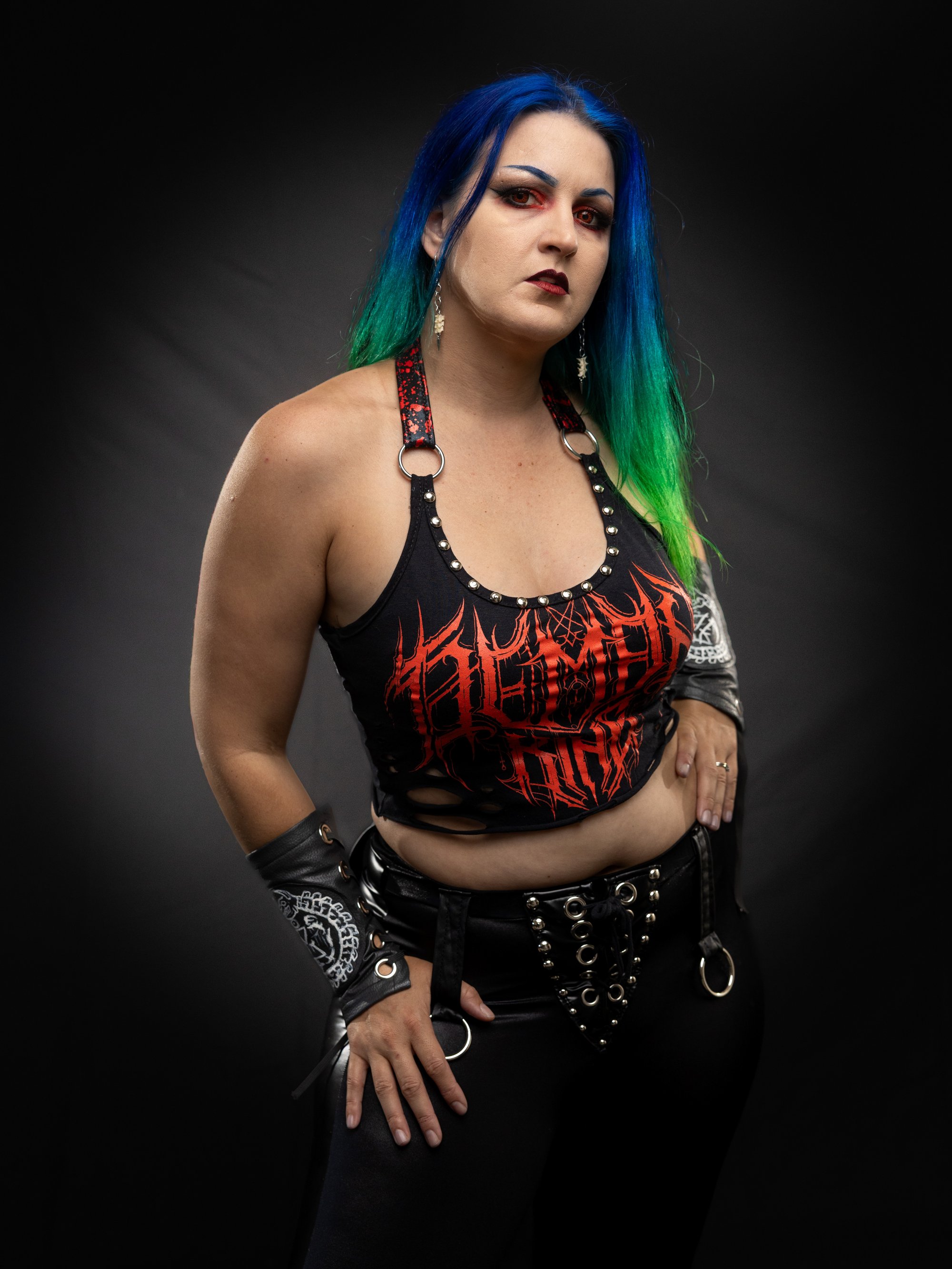 I made this using a brand new, officially licensed Demon King tee. I cut it into a sexy little crop top with a distressed raw hem. I added a blood splattered spandex strap with an adjustable metal slider. I connected the strap with metal O-rings and studded all along the bust. I added a little lace elastic to the back for extra snuggness while still remianing comfortable.