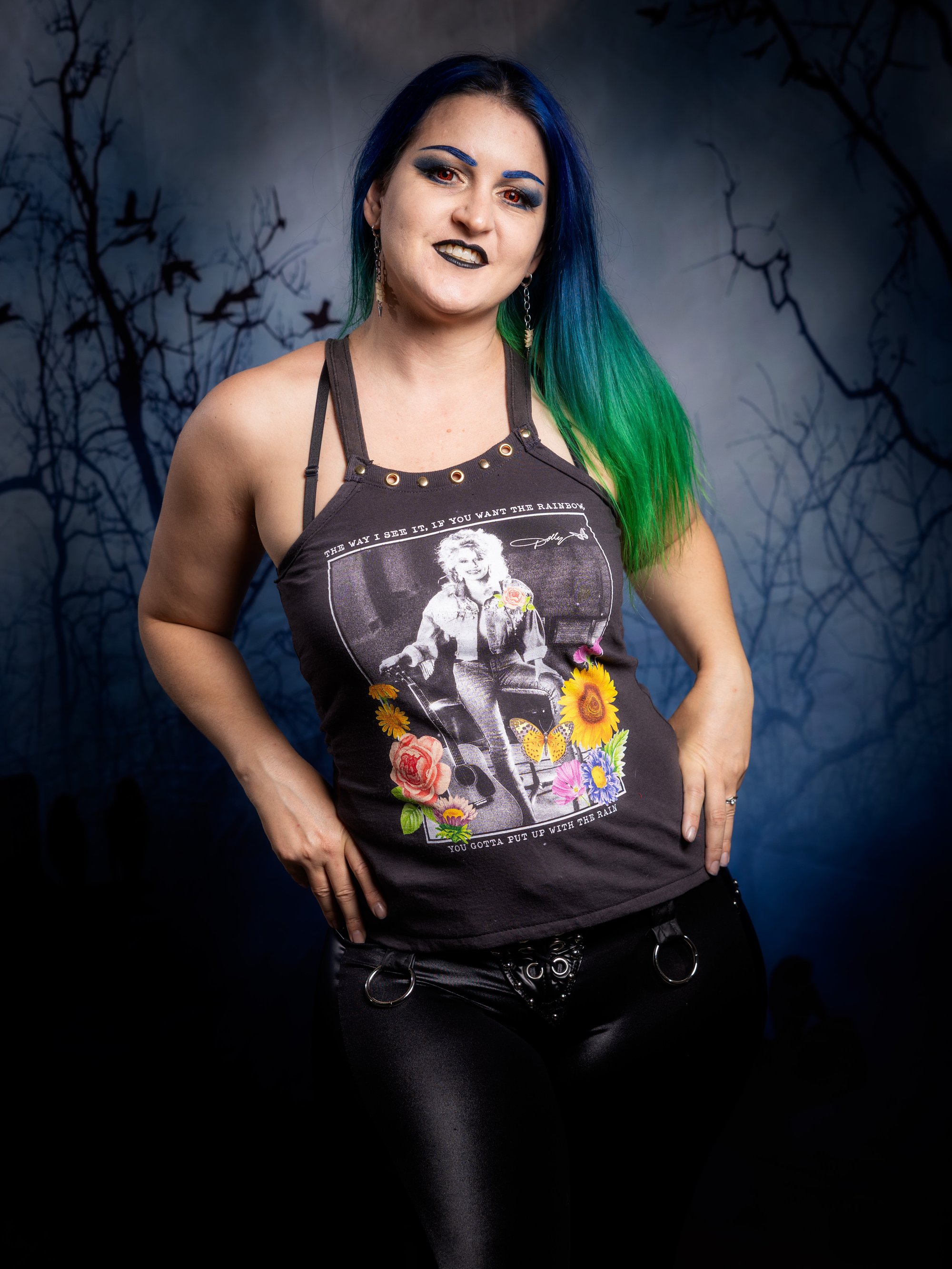 I made this using a previously owned, officially licensed Dolly Parton tee. I cut it into a cute little tank top and added gold colored rivets and eyelets.