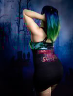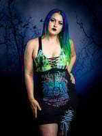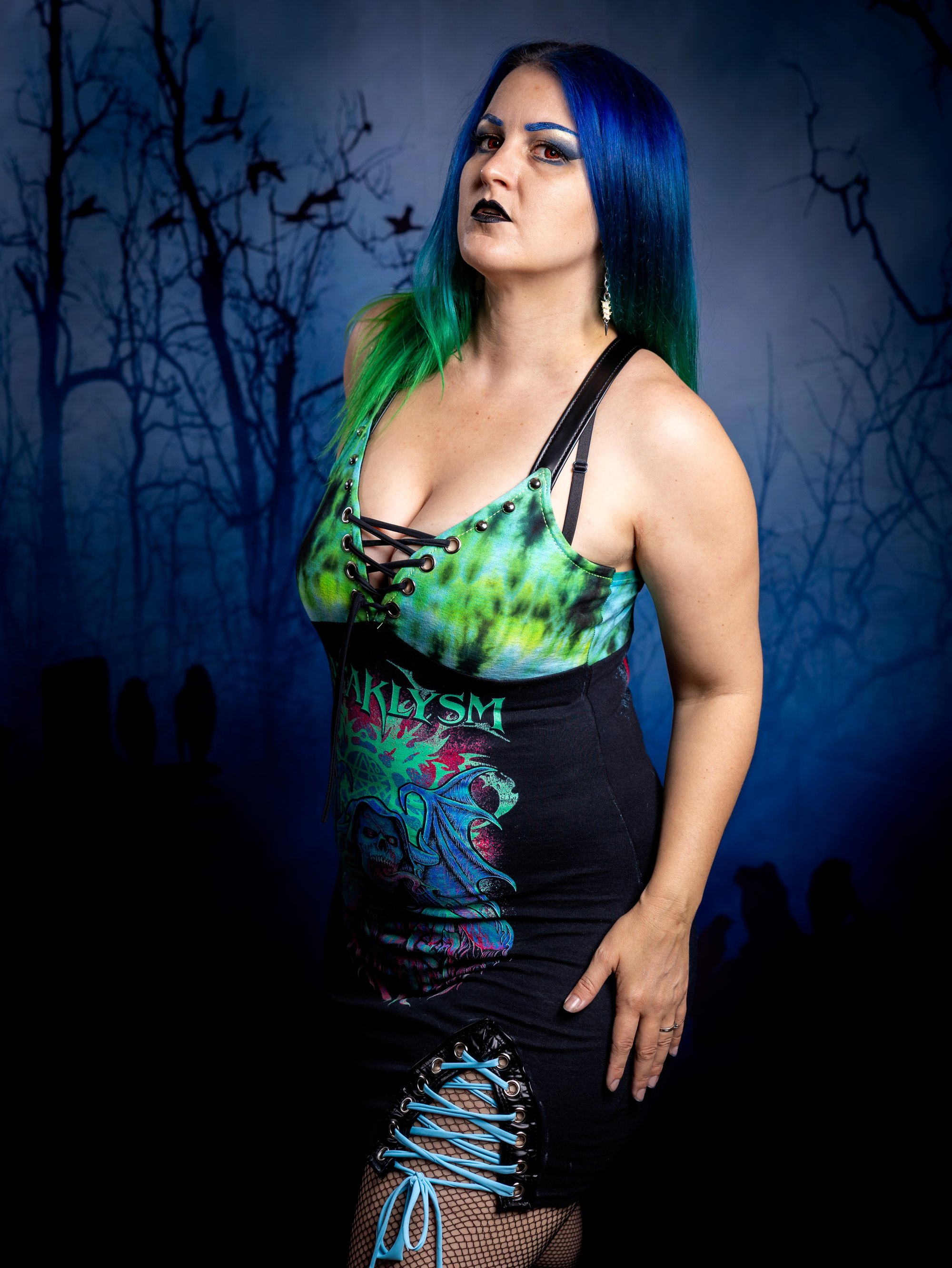 This listing is for one Kataklysm dress. I made this from a brand new, officially licensed Kataklysm band tee. I cut it into a cute little mini dress and added triangle cups made from blue and green tie dyed knit fabric and lined with a t-shirt knit. I added faux leather straps with metyal sliders for an adjustable length. I accented the bust with large metal o-rings for a sexy lace up look. I added a panel of faux leather with eyelets at the thigh and laced it up with light blue elastic.
