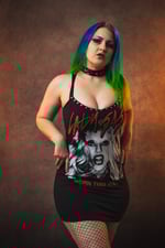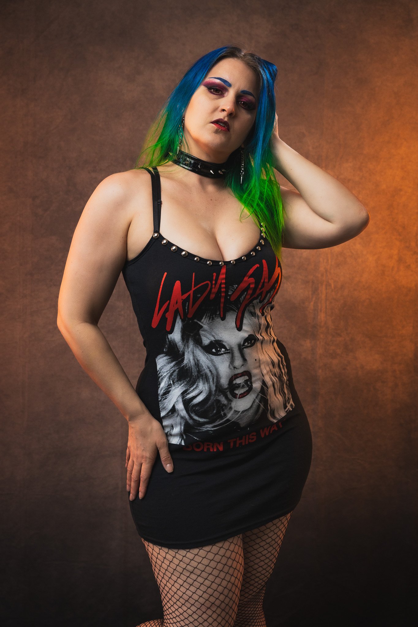 This listing is for one Lady Gaga dress. I made this from a brand new, officially licensed Lady Gaga Born This Way tee. I cut it into a cute little low cut mini dress. I added metal rivets along the bust and adjustable spaghetti straps with plush lingerie elastic.