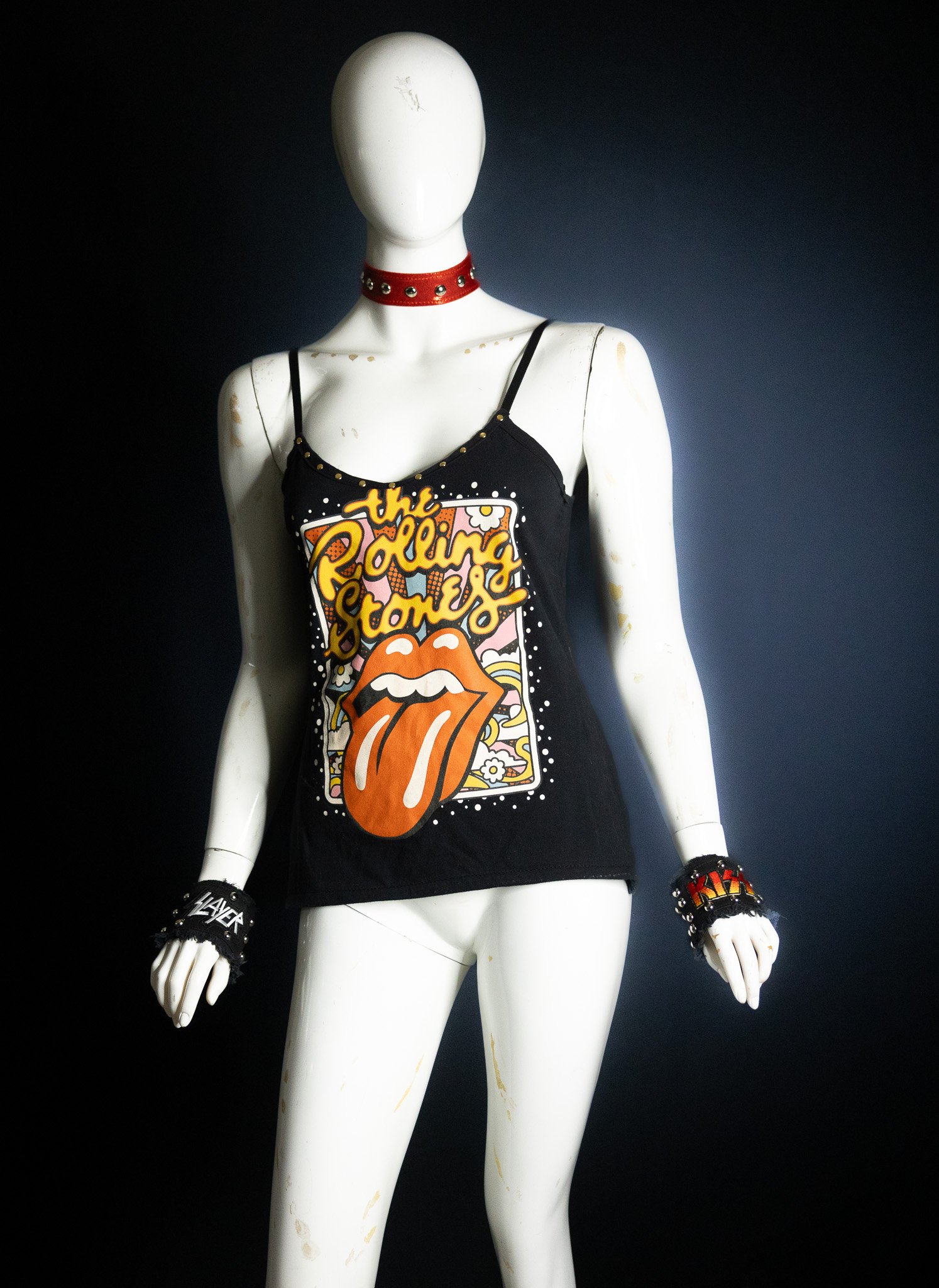 I made this using a previously owned, officially licensed Rolling Stones tee. I cut it up the tee in a figure flattering design and added gold colored metal rivets and eyelets along the neckline. Adjustable straps. Accessories available in another listing.