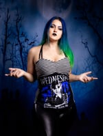 I made this using a previously owned, officially licensed Wednesday tee. I cut it into a cute little top withe a striped sweatheart neckline, elastic straps, and backed it with striped fabric.