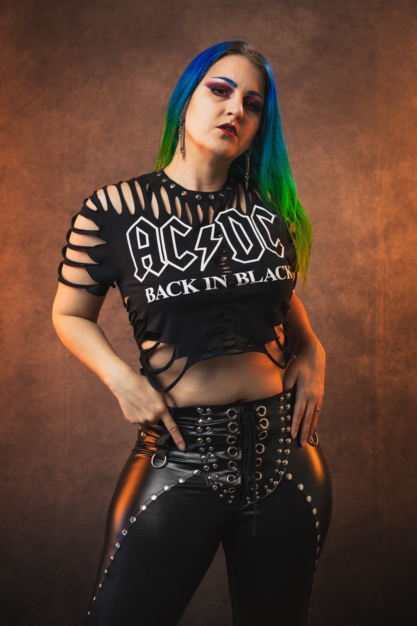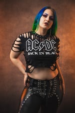 I made this from a brand new, officially licensed AC DC tee. I slashed and studded the neckline for a super sexy and simple look. Made from a unisex small tee.