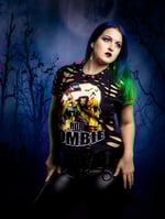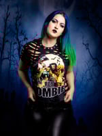 I made this using a brand new, officially licensed Rob Zombie tee. I slashed up the tee in a figure flattering design and added silver colored metal rivets and eyelets along the neckline. Made using a men's small tee.