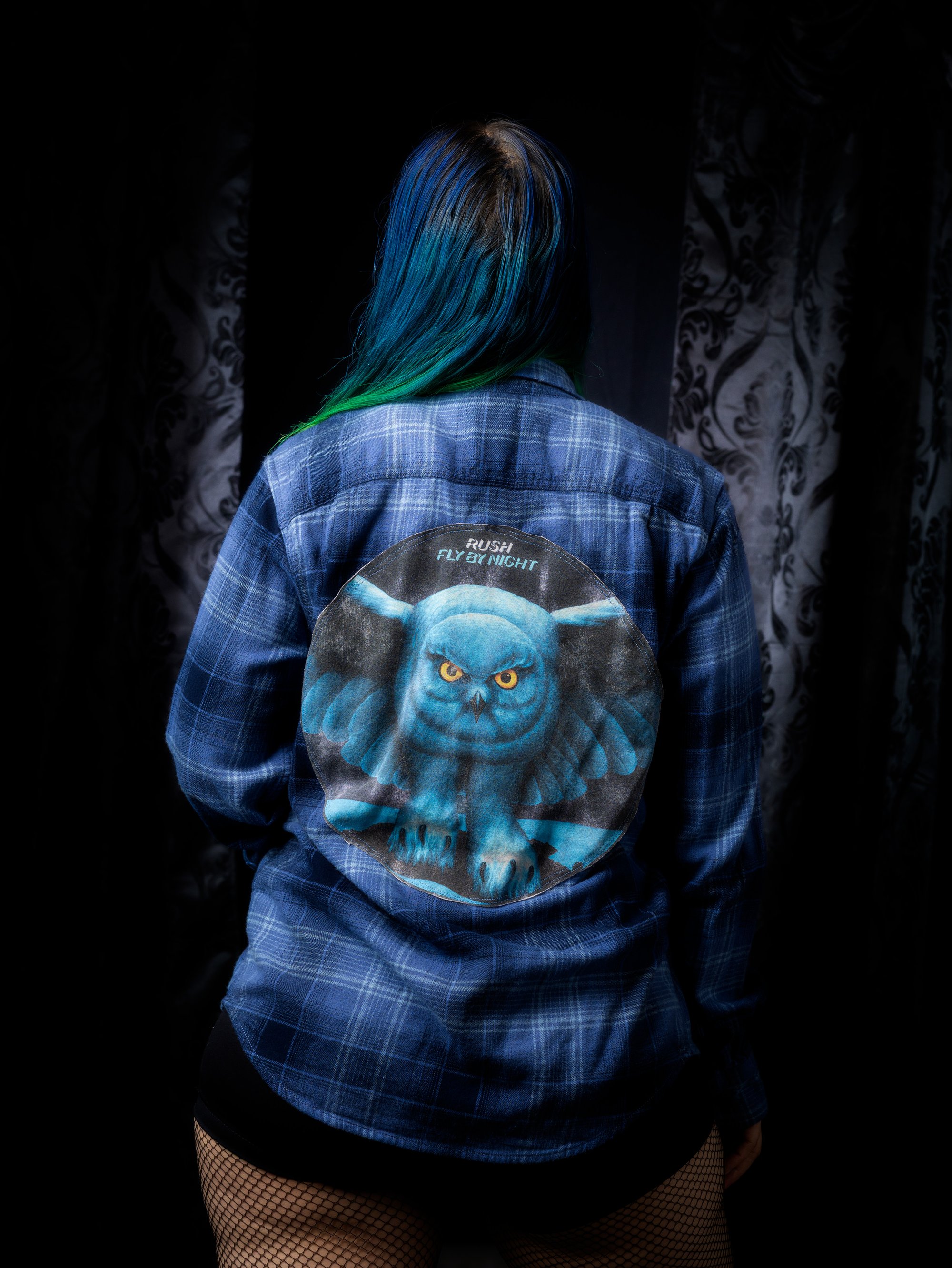 I made this using a thrifted flannel and a previously owned, officially licensed Rush tee. Light-Medium weight flannel material, the brand is George and the colors are various shades of light and medium blues. The flannel is thrifted so it will have some light signs of wear but is in overall good condition.