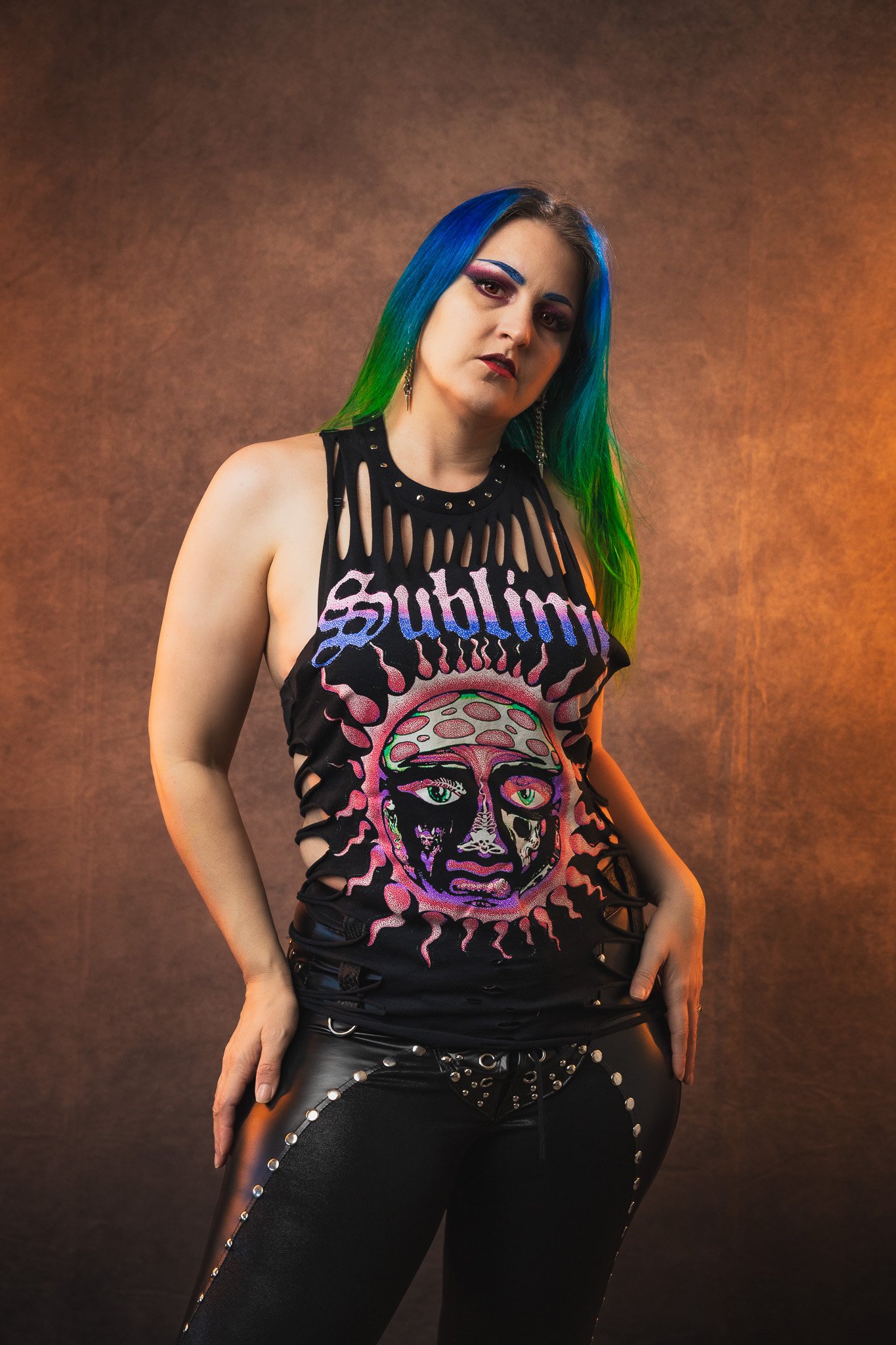 I made this from a brand new, officially licensed Sublime tee. I slashed and studded the neckline for a super sexy and simple look. Made from a unisex small tee.