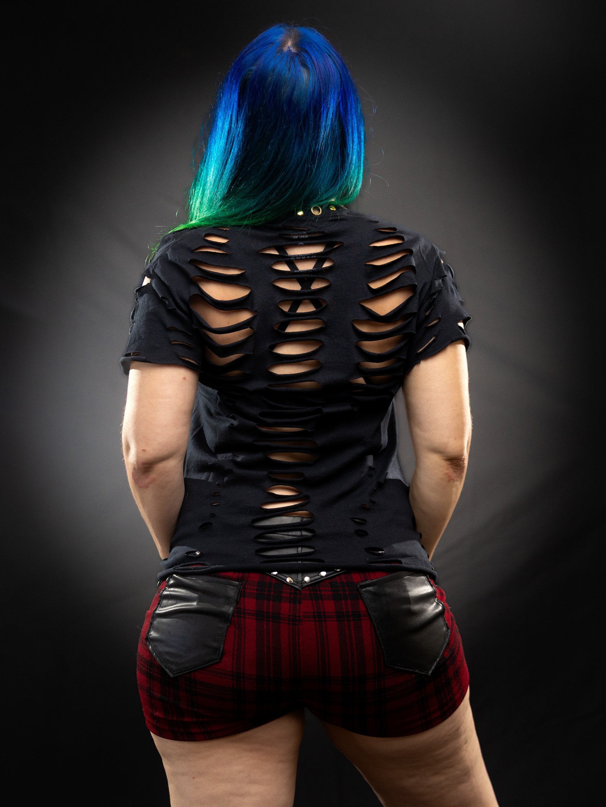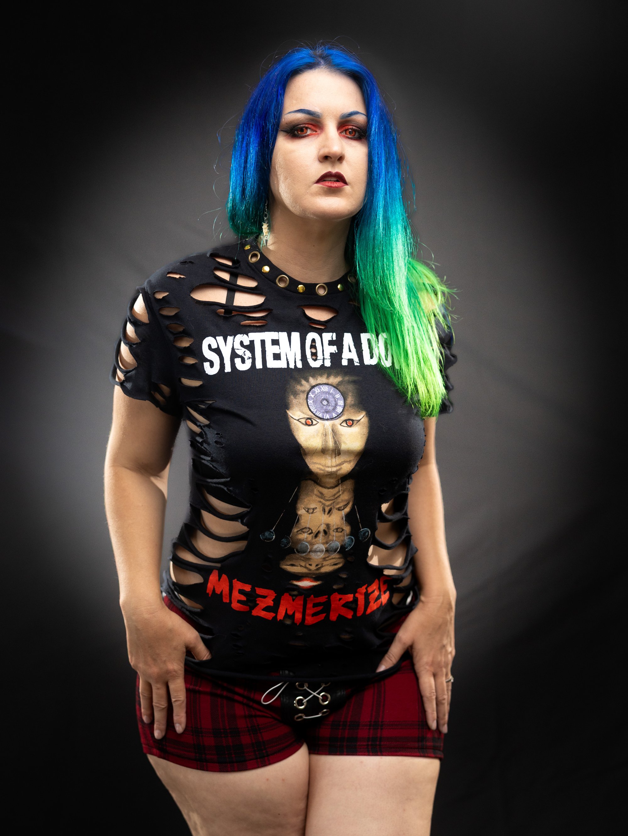 I made this using a brand new, officially licensed System of a Down tee. I slashed up the tee in a figure flattering design and added brass and gold colored metal rivets and eyelets along the neckline. Made using a men's small tee.