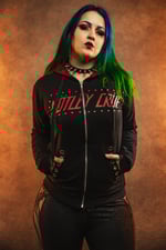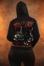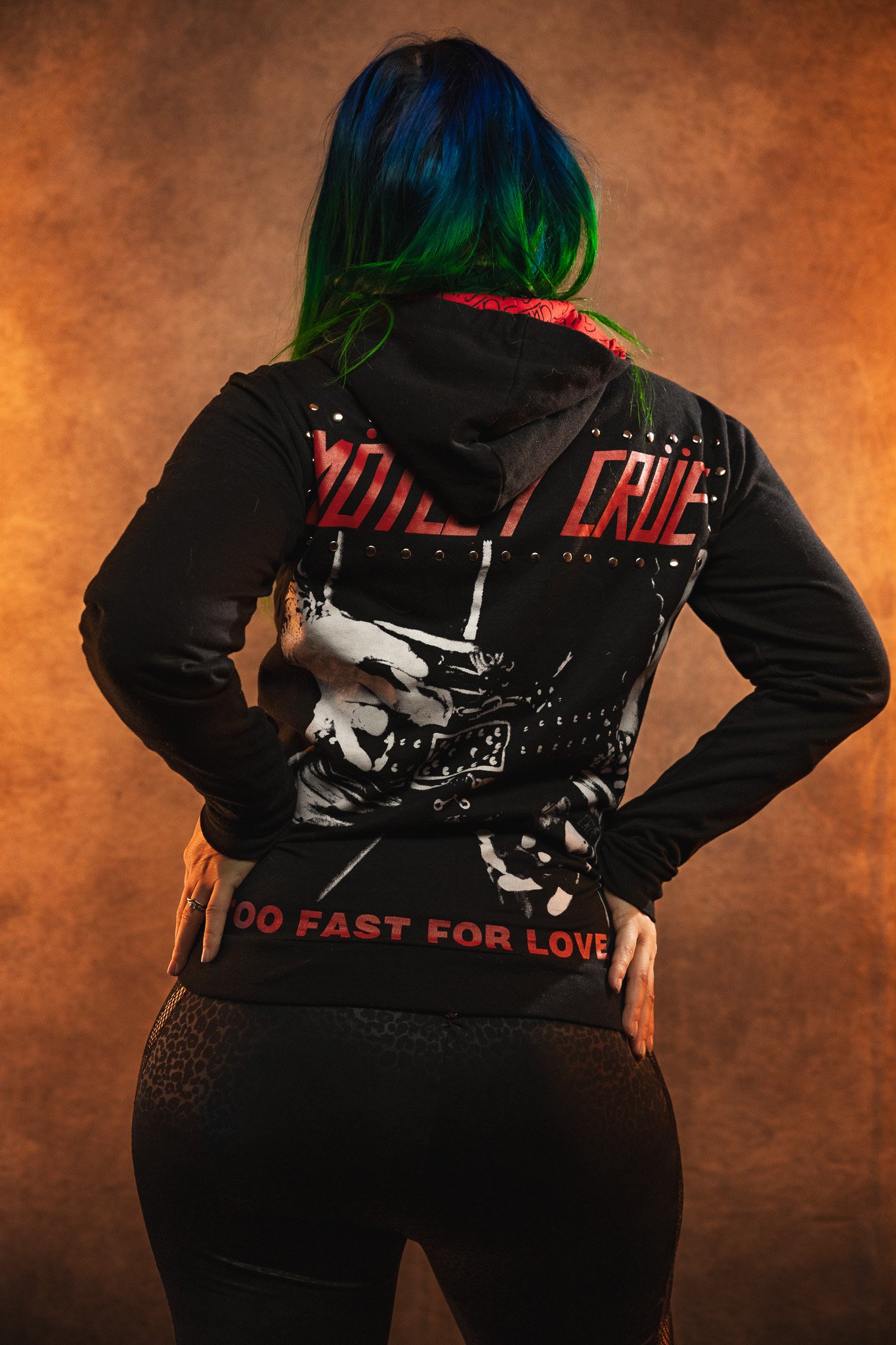 I made this using a previously owned, officially licensed Motley Crue hoodie. I replaced the broken zipper and added accents of metal eyelets and rivets all over. Women's fit hoodie, size small.