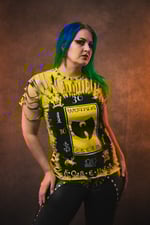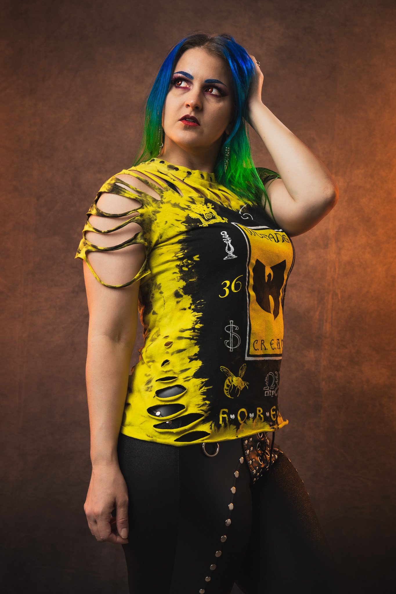 I made this from a brand new, officially licensed Wu-Tang Clan tee.I reverse tie dyed the tee using rit dye remover and high quality tie dyes from Dharma Trading co. I slashed and studded the neckline for a super sexy and simple look. Made from a unisex small tee.