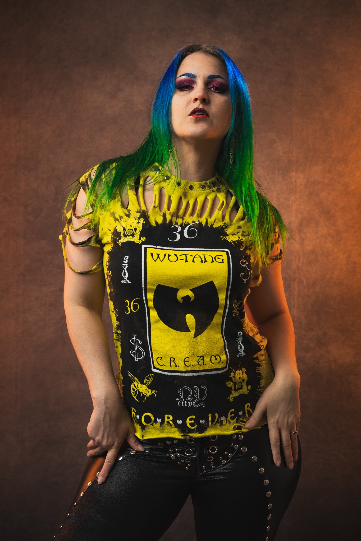 This listing is for one Wu-Tang slashed and studded tie dye tee.
