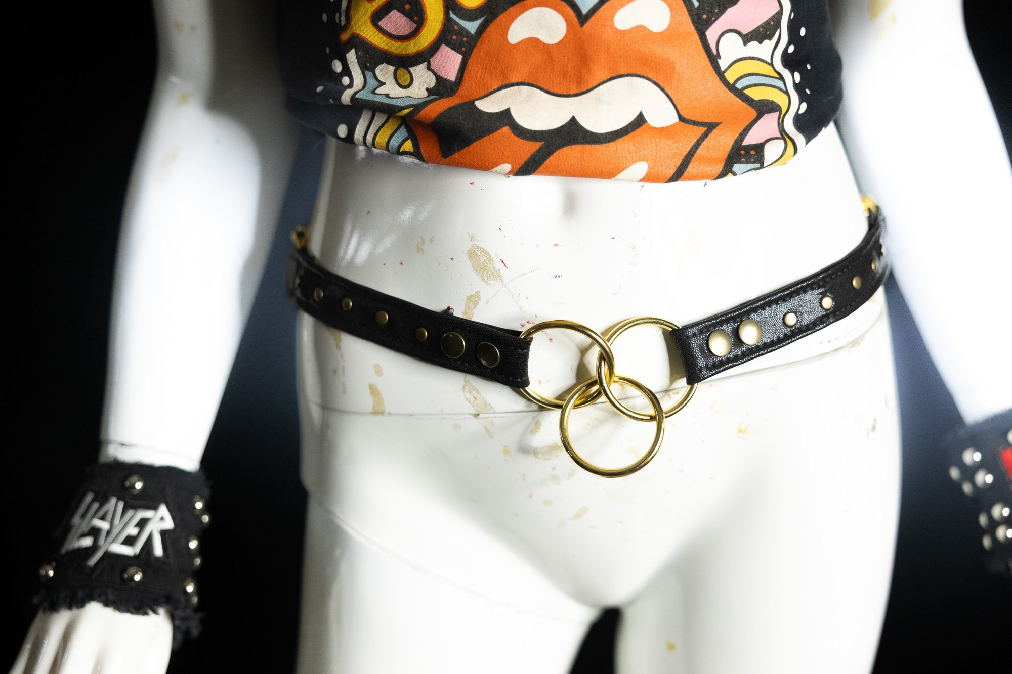This listing is for one Studded O-ring waist belt. Made using thrifted O-rings in a gold finish, chunky gold colored chains, brass rivets and snaps, and leftover black shiny spandex sewn over elastic from straps I made for other sewing projects. Depending on size can be worn on the low waist or middle waist (fits at low waist on my XS mannequin but fits at the small of my waist which is 32 inches). Some slight adjustment with snaps. Some stretch.
