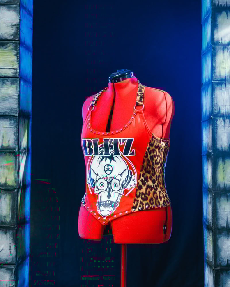 This listing is for one Blitz crop top. I made this using a brand new, officially licensed Blitz tee. I cut it into a cute little crop top with a V shaped hem in front. I added a lace up back for a snatched and adjustable fit. The neckline is accented with metal rivets and leopard print leather straps are connected with metal o-rings and have metal adjustable sliders.