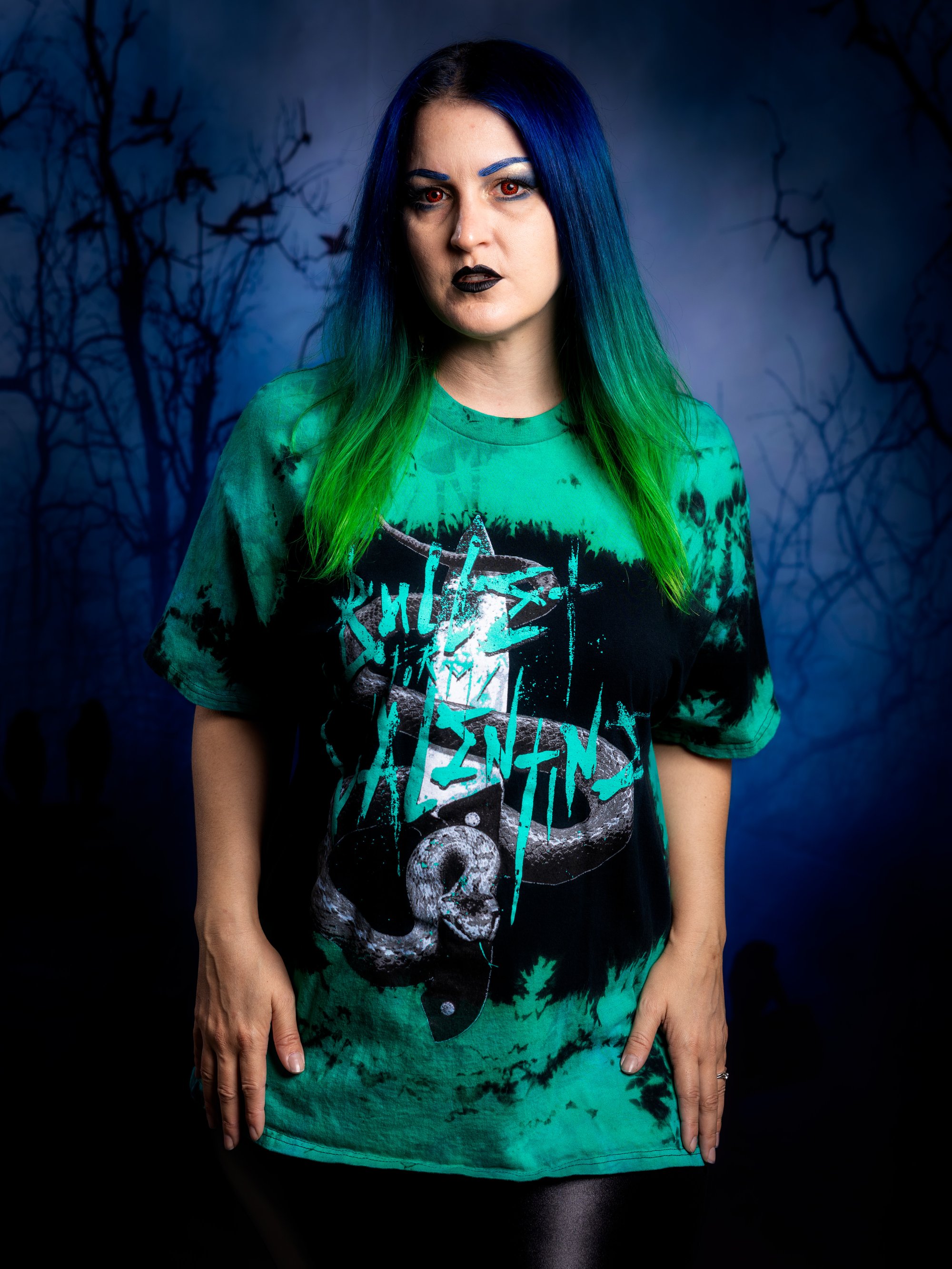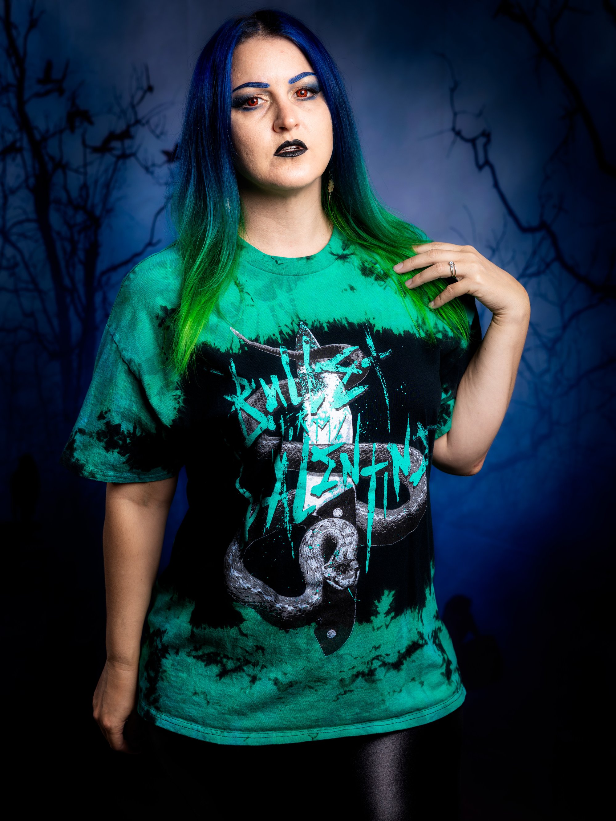 This listing is for one Bullet For My Valentine reverse tie dyed tee. I made this using a brand new, officially licensed BFMV tee. I used Rit's dye remover to lift some of the black on these tees and then tie dyed them using a custom mixed teal dye to match the logo on the shirt. I made two, both are in a size XL. Specify more black or more teal in the dropdown menu to select your preference
