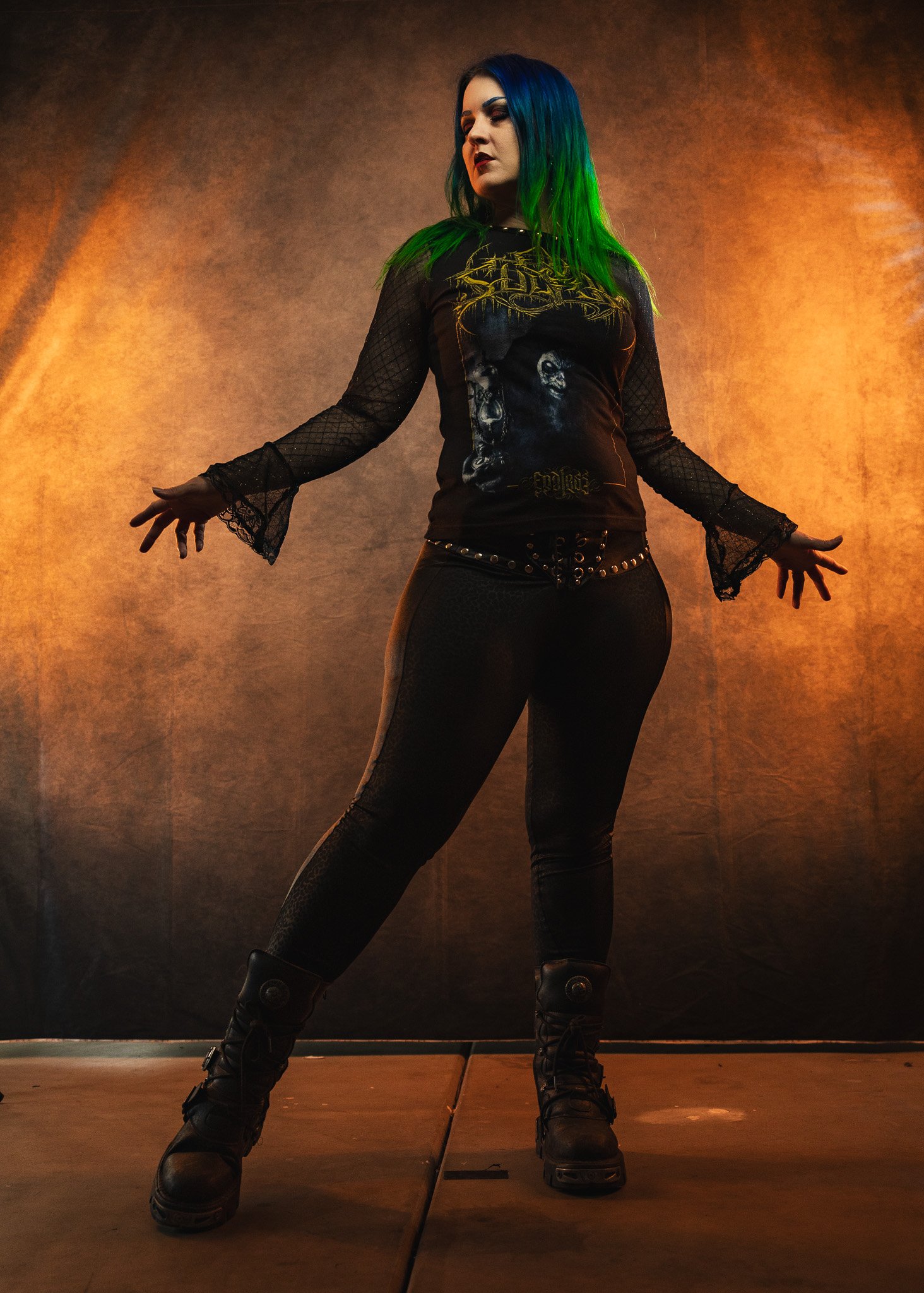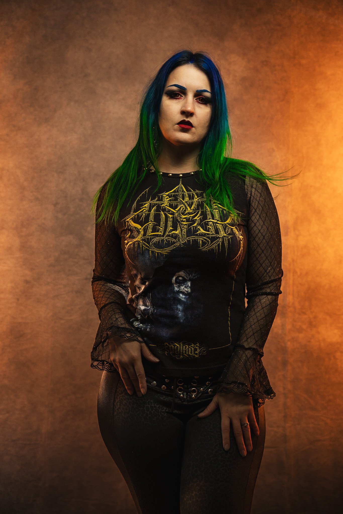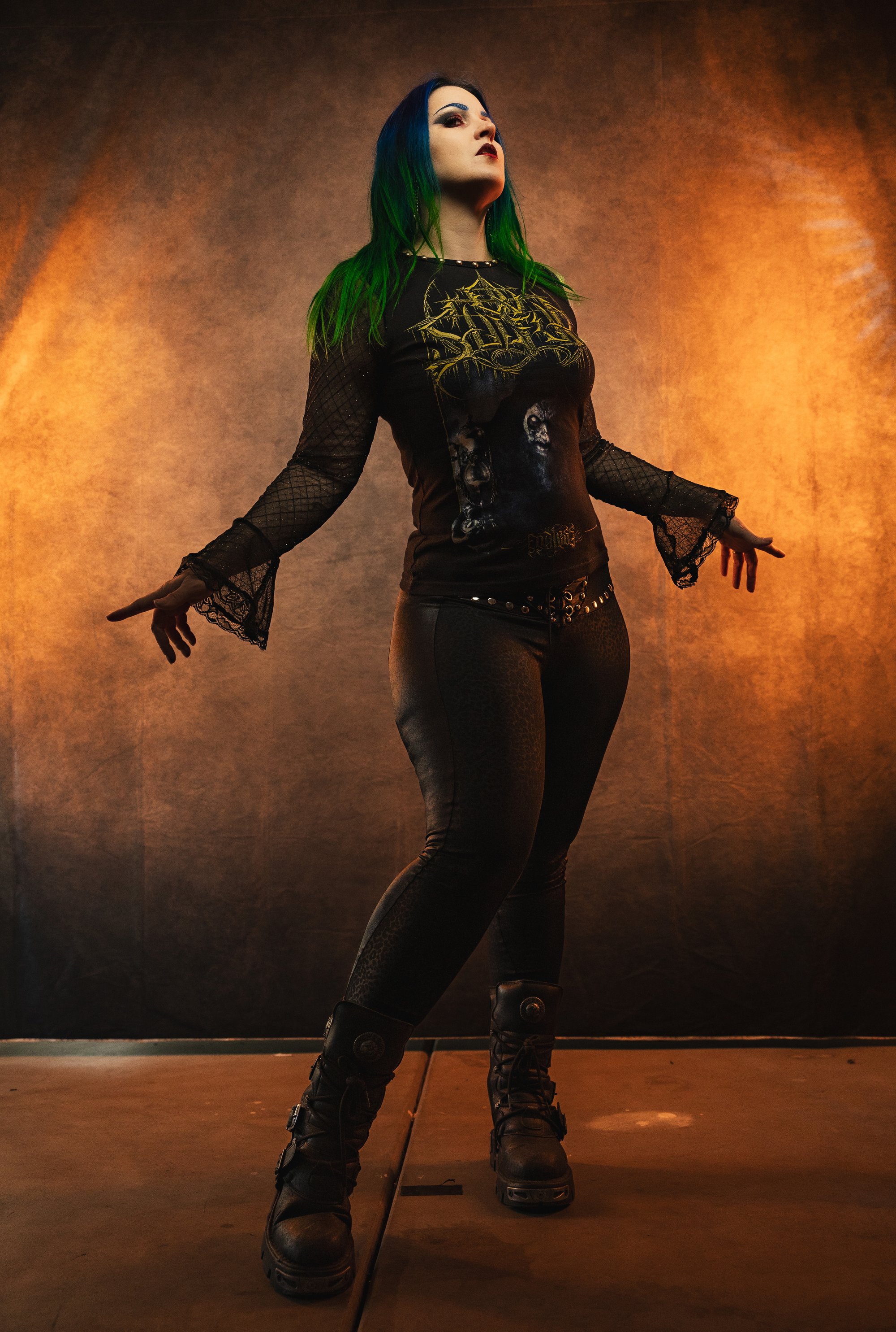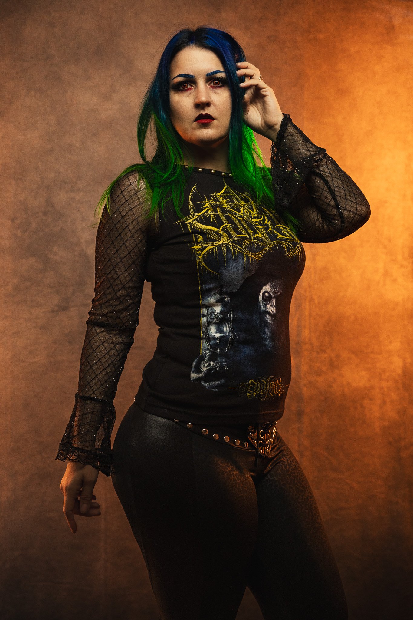 Cut and sewn from a brand new, officially licensed Ov Sulfur tee. I made it into a cute longsleeve top with mesh sleeves that fare at the ends and are accented with black lace. Studded along the neckline with gold colored studs.