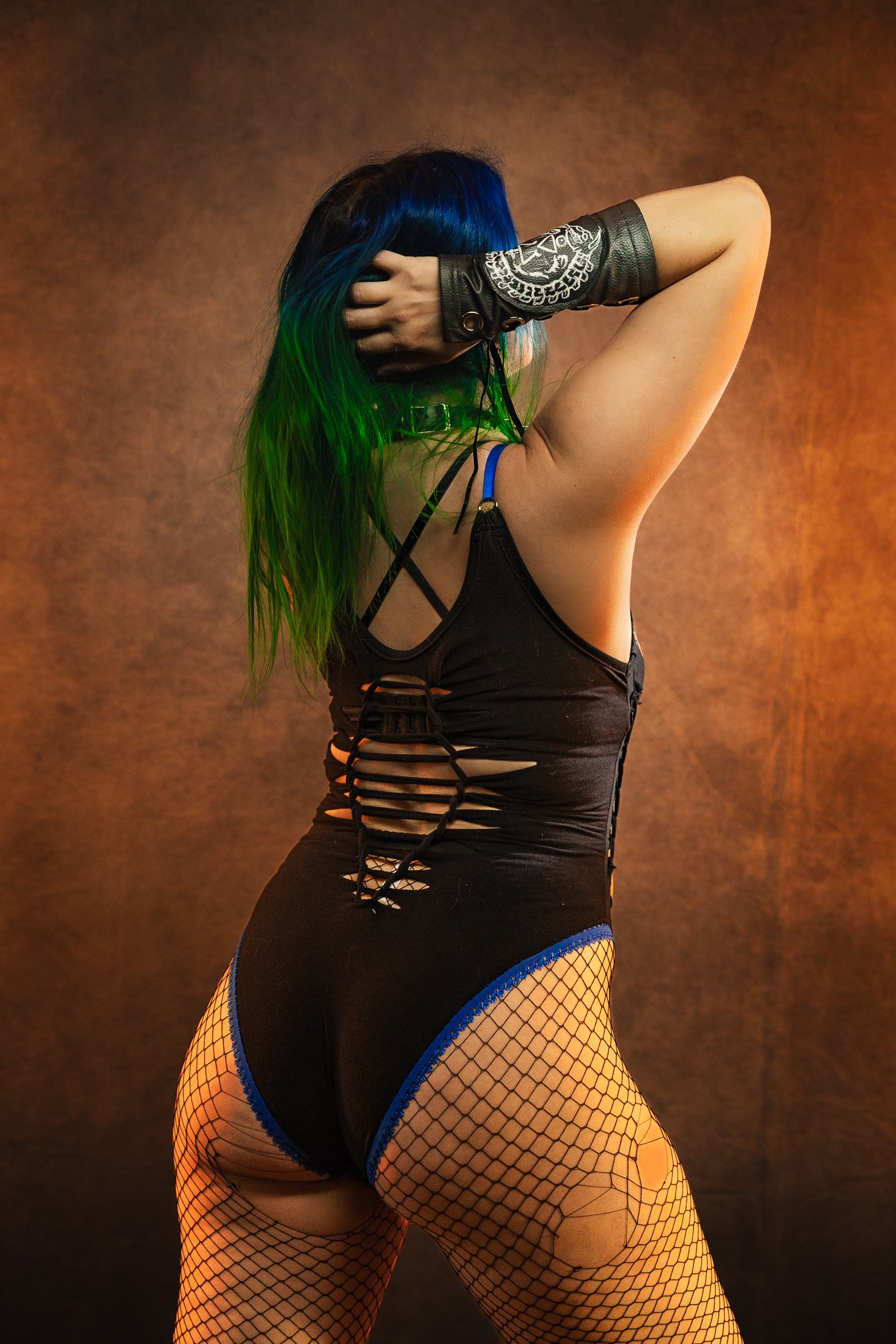 Made from an officially licensed Ozzy tee. Cut and sewn into a bodysuit, slashed at the sides and back, accented the royal blue lace and studed with adjustable straps and snaps at the crotch.