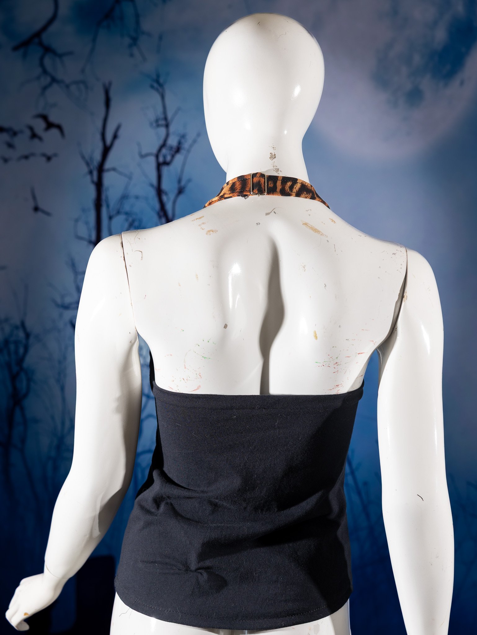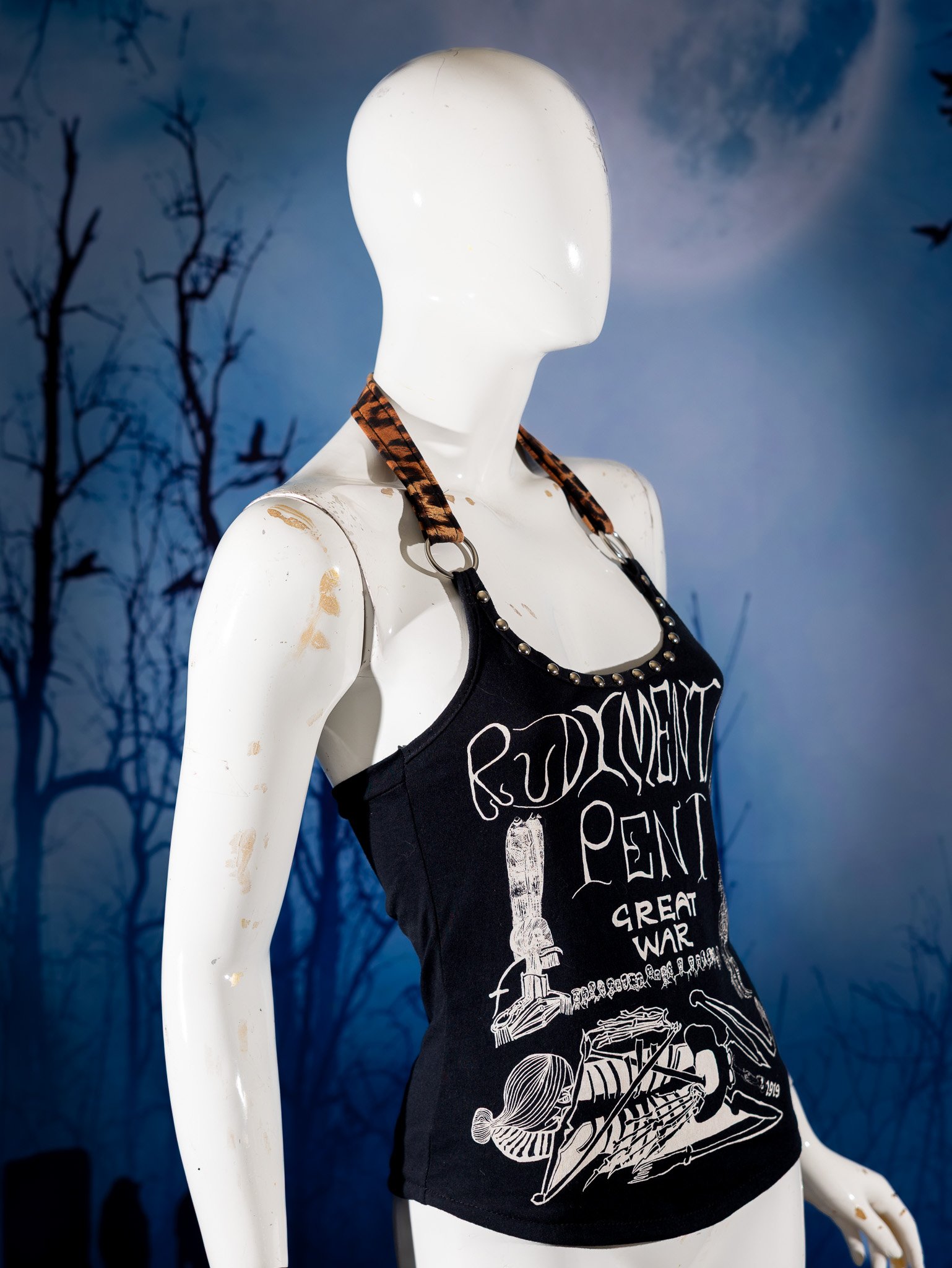 This listing is for one Rudimentary Peni halter top. I made this using a previously owned, officially licensed Rudimentary Peni tee. I cut it into a sexy little halter top. I added silver colored metal rivets along the bust. I added an adjustable leopard print strap with a metal slider connected by metal o-rings.